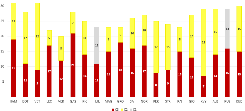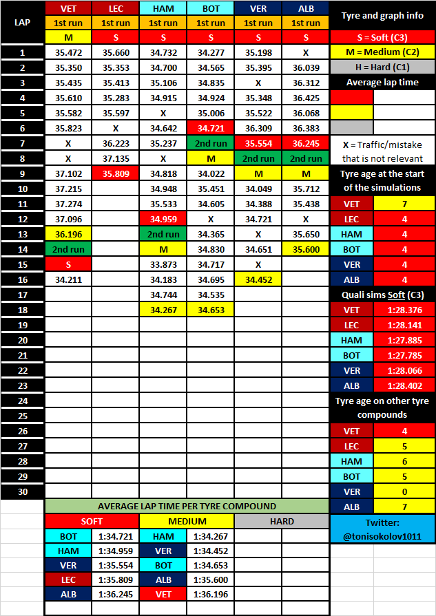 I've always disagreed with just deleting laps because you "feel" like they are not relevant. For example, in Vettel's data there's a 1:35.823. Then there are two deleted laps. The first one is a 1:39.349, which is an abnormal lap, but the next one is a 1:37.107. Why was that 1:37.107 lap deleted? The following lap is a 1:37.102, so that 1:37.107 is definitely in line with the rest of the laps. Deleting that lap lowers his average time, so I'm not sure why would someone decide to remove that particular lap.basvn schreef op vrijdag 11 oktober 2019 @ 09:49: