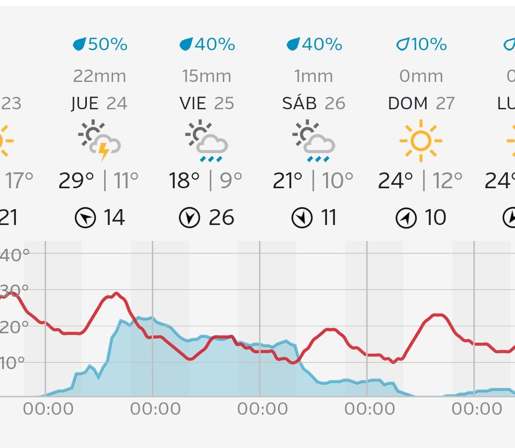 La previsión apunta posibilidad media de lluvia, mayormente por la tarde noche. Temperaturas más altas (22-24C) para domingo. Viento para viernes.