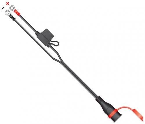 Accu > Optimate connector met zekering (a) > Optimate verlengkabel (b) doorknippen en solderen aan Garmin voeding (c) > Garmin (d).
