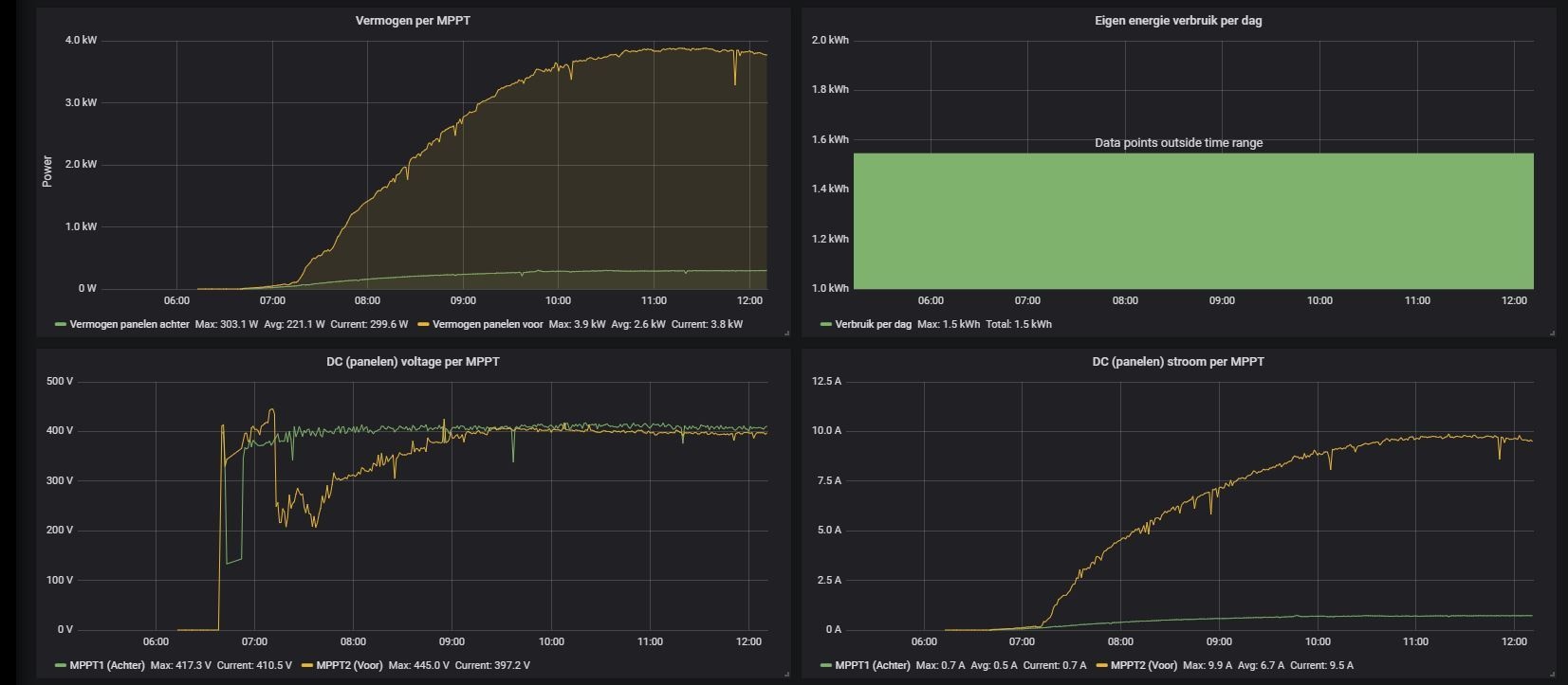 Het gaat om de gele lijn in de grafiek links onder. Dat is de ZO string 12x320Wp op MPPT 2. Die groene is de identieke string op NW op MPPT 1.