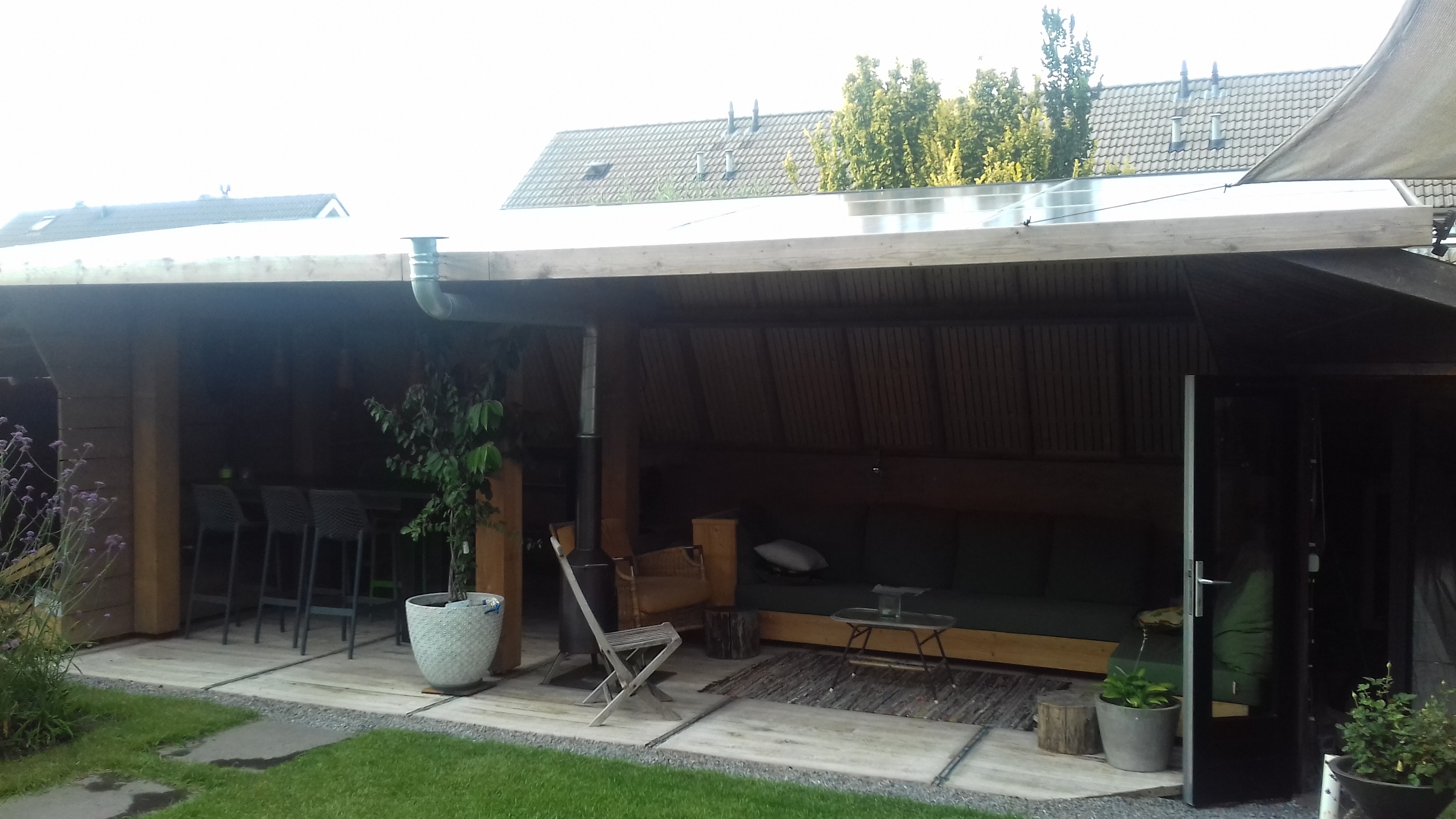 Foto: schoorsteen heeft extra verlenging, die zet ik erop als de kachel aan moet komende winter.Nu geeft ie schaduw.