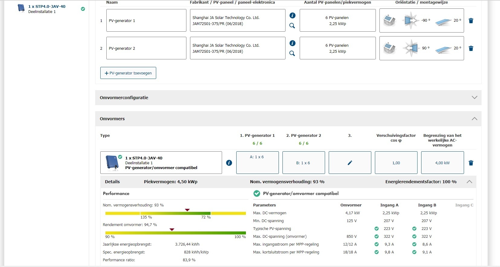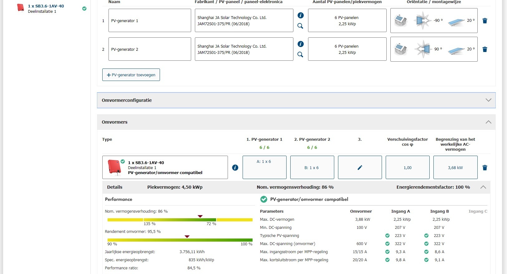 7x245Wp(15 graden) + 7x245Wp(45 graden) op oost en 10x300Wp(45 graden) op west. (4kW omvormer)