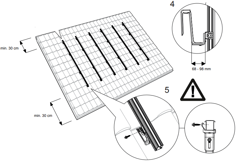 verticale rail? dan schroefjes er door! Dakpannen horen nauw te sluiten vooral om inwaaien van stuifsneeuw (dat later gaat smelten) te voorkomen en opgestuwde regen tegen te houden. Maar nu komen daar waar de haken zitten meestal panelen te liggen (dat is het grote idee) en daarmee stormt het daar ter plaatse een stuk minder dan op de rest van het dak. vandaar dat ze een stukje open mogen staan. En daarom is het ook handig de onderste rail niet te laag te plaatsen (ook voor het kijken op de rail en de haak; WAF).