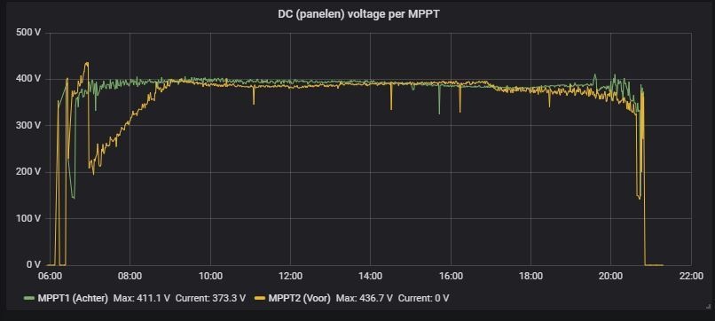 Als ik dan naar het DC voltage kijk van beide strings zie ik: