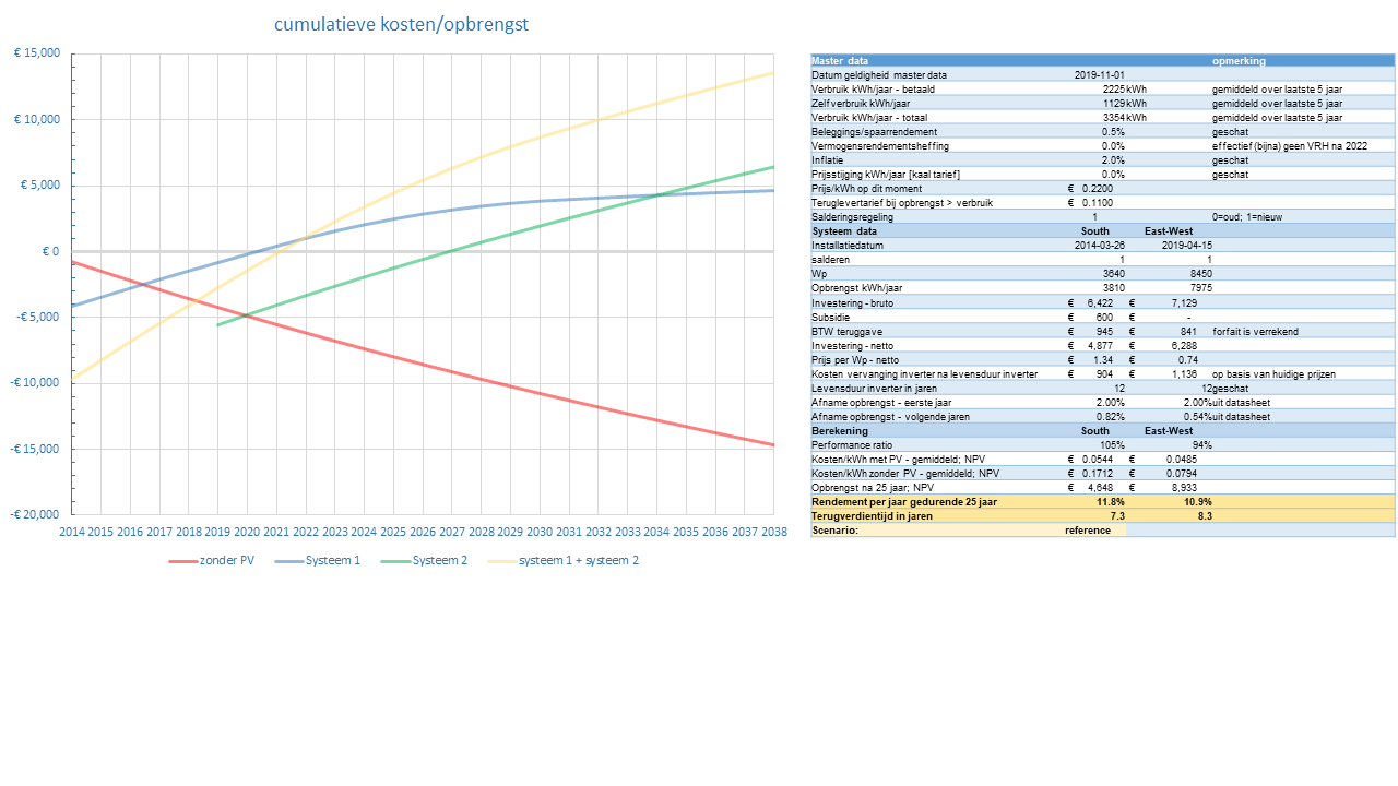 Rendement wel zo te zien, heb je daar degradatie en defecten in meegenomen? En dan bedoel ik eigenlijk nog een lijstje in euro waar je op uit komt na die 25 jaar. Of liever 10 jaar eigenlijk, dat is vervangings termijn en alleen langer is keuze/meegenomen.cville schreef op zondag 3 november 2019 @ 19:32: