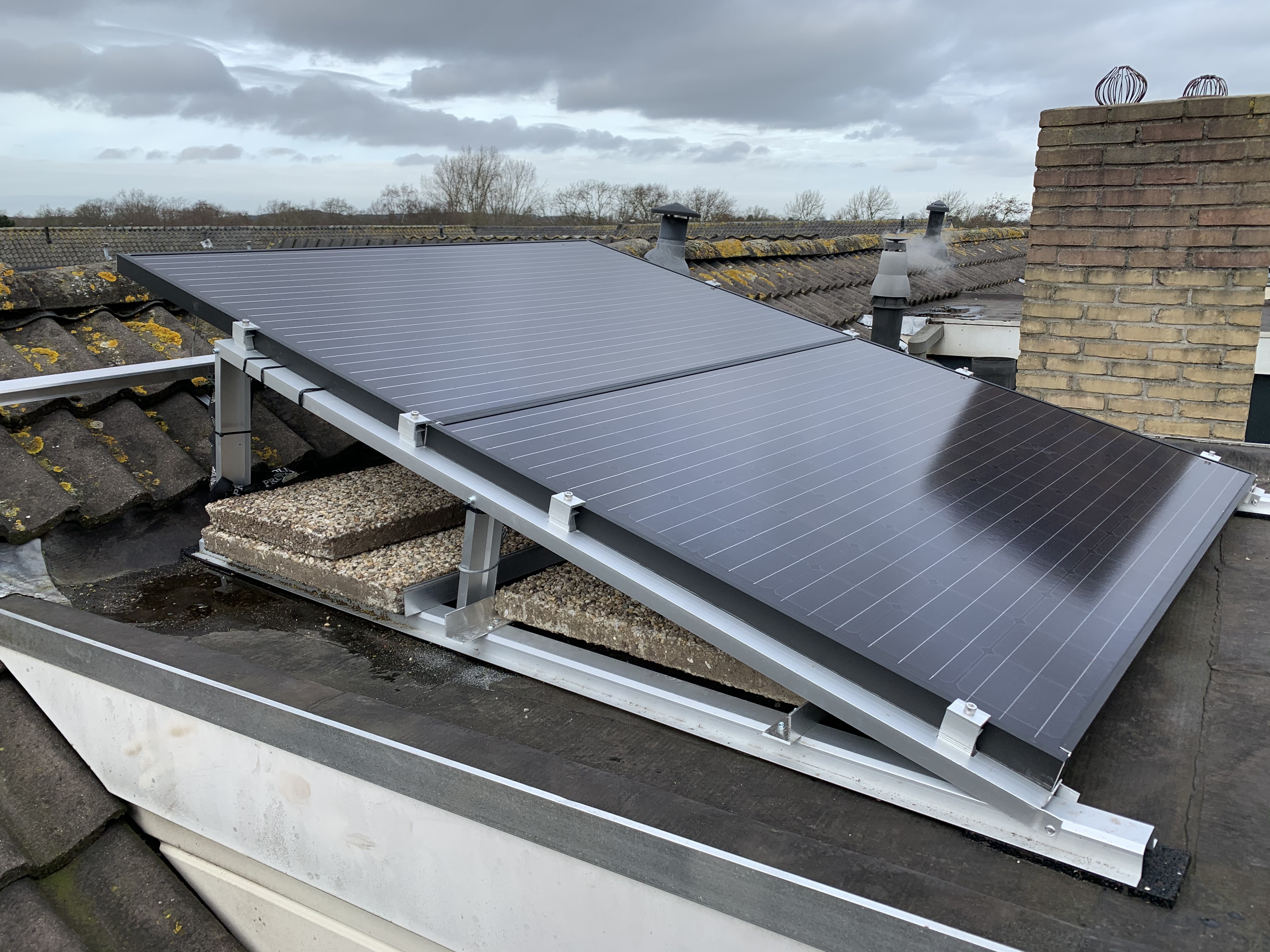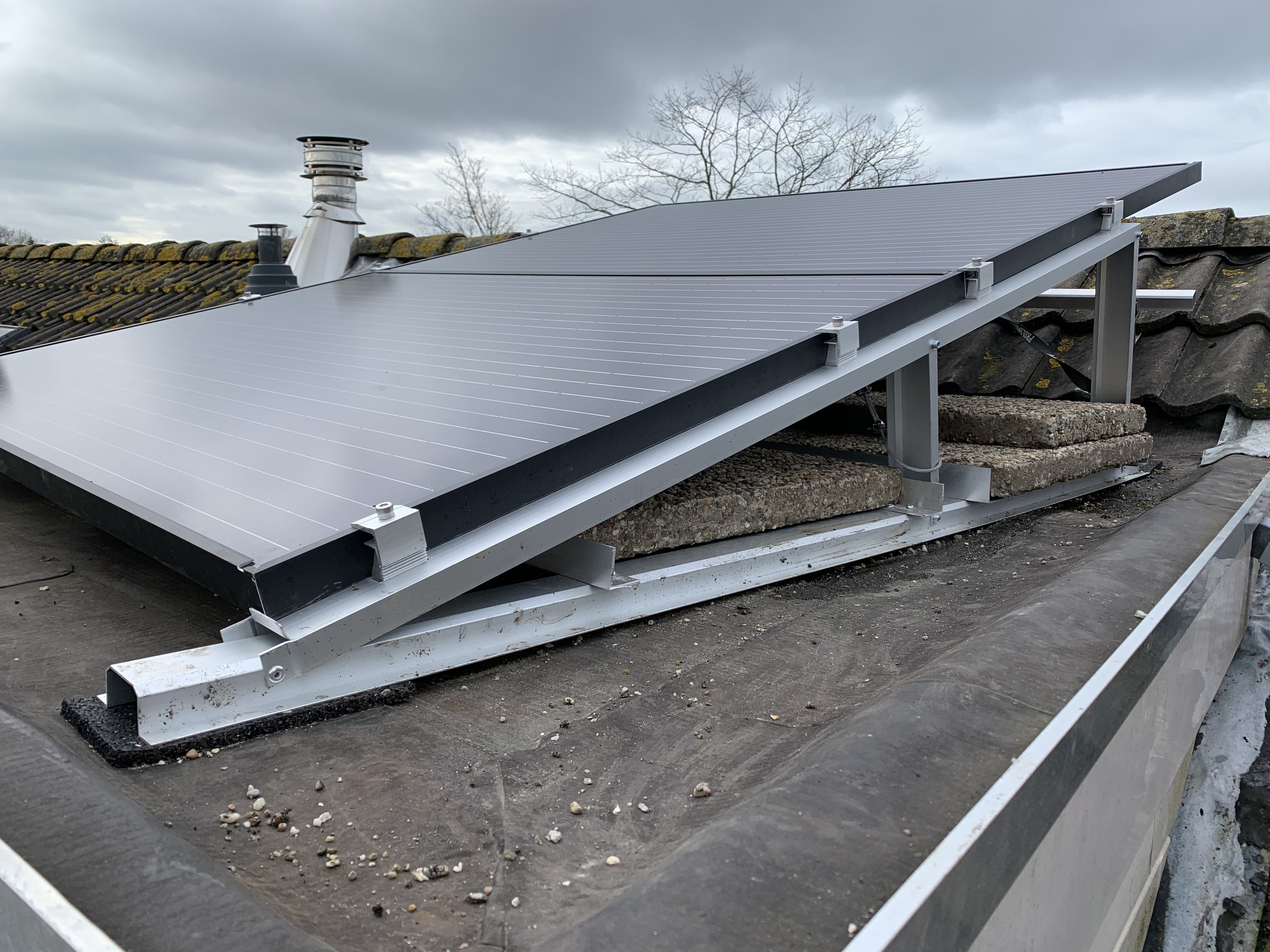 Platte dak 8x 335wp (2680wp) met een hellingshoek van ongeveer 7 graden.
