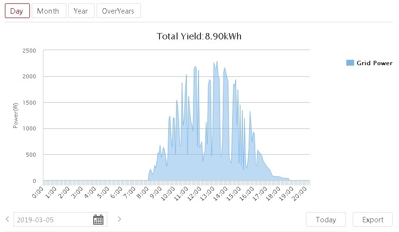 [{"id":"6bd12b5b.b59914","type":"function","z":"c651b981.0ef3e8","name":"extract buffer data","func":"let DCCurrent1 = msg.payload[1] / 1000; // 30769\nlet DCVoltage1 = msg.payload[3] / 100; // 30771\nlet DCPower1 = msg.payload[5]; // 30773\nlet PowerTot = msg.payload[7]; // 30775\nlet PowerL1 = msg.payload[9]; // 30777\nlet PowerL2 = msg.payload[11]; // 30779\nlet PowerL3 = msg.payload[13]; // 30781\n\nlet GridVoltagePhase1= 0;\nif (msg.payload[15] !== 65535) {\n GridVoltagePhase1 = msg.payload[15] / 100; // 30783\n}\n\nlet GridVoltagePhase2= 0;\nif (msg.payload[17] !== 65535) {\n GridVoltagePhase2 = msg.payload[17] / 100; // 30785\n}\n\nlet GridVoltagePhase3= 0;\nif (msg.payload[19] !== 65535) {\n GridVoltagePhase3 = msg.payload[19] / 100; // 30787\n}\n\nlet GridCurrent = 0;\nif (msg.payload[27] !== 65535) {\n GridCurrent = msg.payload[27] / 1000; // 30795\n}\n\nlet GridFrequency = 0;\nif (msg.payload[35] !== 65535) {\n GridFrequency = msg.payload[35] / 100; // 30803\n}\n\nlet _msg = {\n payload: []\n};\n\n_msg.payload.push(\n {\n\t\tmeasurement: \"energy\",\n\t\tfields: {\n\t\t\tdc_current1: DCCurrent1,\n\t\t\tdc_voltage1: DCVoltage1,\n\t\t\tdc_power1: DCPower1, \n\t\t\tac_power_tot: PowerTot,\n\t\t\tac_power1: PowerL1,\n\t\t\tac_power2: PowerL2,\n\t\t\tac_power3: PowerL3,\n\t\t\tac_voltage1: GridVoltagePhase1,\n\t\t\tac_voltage2: GridVoltagePhase2,\n\t\t\tac_voltage3: GridVoltagePhase3,\n\t\t\tac_current: GridCurrent,\n\t\t\tac_frequency: GridFrequency\n\t\t},\n\t\ttags:{\n\t\t device: \"inverter\",\n\t\t direction: \"south\"\n\t\t},\n\t\ttimestamp: new Date()\n\t}\n);\n\nreturn _msg;","outputs":1,"noerr":0,"x":390,"y":60,"wires":[["ba15ca1b.aca9b8"]]},{"id":"ce71f1b7.219f5","type":"modbustcp-read","z":"c651b981.0ef3e8","name":"SMA - DC1 & AC","topic":"","dataType":"HoldingRegister","adr":"30769","quantity":"36","rate":"20","rateUnit":"s","server":"c2b35adc.198a88","ieeeType":"off","ieeeBE":"true","x":130,"y":60,"wires":[["6bd12b5b.b59914"]]},{"id":"b264409c.c97c5","type":"influxdb batch","z":"c651b981.0ef3e8","influxdb":"699a1238.0f00bc","precision":"","retentionPolicy":"","name":"","x":780,"y":60,"wires":[]},{"id":"5a9fe0e2.6923d","type":"debug","z":"c651b981.0ef3e8","name":"","active":false,"tosidebar":true,"console":false,"tostatus":false,"complete":"false","x":760,"y":120,"wires":[]},{"id":"ba15ca1b.aca9b8","type":"switch","z":"c651b981.0ef3e8","name":"","property":"payload[0].fields.dc_power1","propertyType":"msg","rules":[{"t":"neq","v":"0","vt":"num"}],"checkall":"true","repair":false,"outputs":1,"x":570,"y":60,"wires":[["b264409c.c97c5","5a9fe0e2.6923d"]]},{"id":"52d603e3.c20b0c","type":"modbustcp-read","z":"c651b981.0ef3e8","name":"SMA - DC2 & AC & TMP","topic":"","dataType":"HoldingRegister","adr":"30953","quantity":"36","rate":"30","rateUnit":"s","server":"c2b35adc.198a88","ieeeType":"off","ieeeBE":"true","x":150,"y":140,"wires":[["501a84d8.36d95c"]]},{"id":"501a84d8.36d95c","type":"function","z":"c651b981.0ef3e8","name":"extract buffer data","func":"let InternalTemperature = msg.payload[1] / 10; // 30953\nlet DCCurrent2 = msg.payload[5] / 1000; // 30957\nlet DCVoltage2 = msg.payload[7] / 100; // 30959\nlet DCPower2 = msg.payload[9] ; // 30961\nlet ACCurrentL1 = msg.payload[25] / 1000; // 30977\nlet ACCurrentL2 = msg.payload[27] / 1000; // 30979\nlet ACCurrentL3 = msg.payload[29] / 1000; // 30981\n\n\nlet _msg = {\n payload: []\n};\n\n_msg.payload.push(\n {\n\t\tmeasurement: \"energy\",\n\t\tfields: {\n\t\t\ttemperature: InternalTemperature,\n\t\t\tdc_current2: DCCurrent2,\n\t\t\tdc_voltage2: DCVoltage2,\n\t\t\tdc_power2: DCPower2,\n\t\t\tac_current1: ACCurrentL1,\n\t\t\tac_current2: ACCurrentL2,\n\t\t\tac_current3: ACCurrentL3\n\t\t},\n\t\ttags:{\n\t\t device: \"inverter\",\n\t\t direction: \"south\"\n\t\t},\n\t\ttimestamp: new Date()\n\t}\n);\n\nreturn _msg;","outputs":1,"noerr":0,"x":390,"y":140,"wires":[["90d60307.53429"]]},{"id":"90d60307.53429","type":"switch","z":"c651b981.0ef3e8","name":"","property":"payload[0].fields.temperature","propertyType":"msg","rules":[{"t":"neq","v":"0","vt":"num"}],"checkall":"true","repair":false,"outputs":1,"x":570,"y":140,"wires":[["5a9fe0e2.6923d","b264409c.c97c5"]]},{"id":"1e444834.7efdb8","type":"modbustcp-read","z":"c651b981.0ef3e8","name":"SMA - YIELD","topic":"","dataType":"HoldingRegister","adr":"30531","quantity":"6","rate":"30","rateUnit":"s","server":"c2b35adc.198a88","ieeeType":"off","ieeeBE":"true","x":120,"y":220,"wires":[["4e8dc982.94d448"]]},{"id":"4e8dc982.94d448","type":"function","z":"c651b981.0ef3e8","name":"extract buffer data","func":"let TotalYield = msg.payload[1] / 1000; // 30531\nlet DailyYield = msg.payload[5] / 1000; // 30435\nlet _msg = {\n payload: []\n};\n\n_msg.payload.push(\n {\n\t\tmeasurement: \"energy\",\n\t\tfields: {\n\t\t\ttotalyield: TotalYield,\n\t\t\tdailyyield: DailyYield\n\t\t},\n\t\ttags:{\n\t\t device: \"inverter\",\n\t\t direction: \"south\"\n\t\t},\n\t\ttimestamp: new Date()\n\t}\n);\n\nreturn _msg;","outputs":1,"noerr":0,"x":390,"y":220,"wires":[["395133f5.f8528c"]]},{"id":"395133f5.f8528c","type":"switch","z":"c651b981.0ef3e8","name":"","property":"payload[0].fields.totalyield","propertyType":"msg","rules":[{"t":"neq","v":"0","vt":"num"}],"checkall":"true","repair":false,"outputs":1,"x":570,"y":220,"wires":[["5a9fe0e2.6923d","b264409c.c97c5"]]},{"id":"c2b35adc.198a88","type":"modbustcp-server","z":"","name":"SMA STP 5000","host":"192.168.0.120","port":"502","unit_id":"3","reconnecttimeout":"30"},{"id":"699a1238.0f00bc","type":"influxdb","z":"","hostname":"127.0.0.1","port":"8086","protocol":"http","database":"energy","name":"","usetls":false,"tls":"7e968262.aacabc"},{"id":"7e968262.aacabc","type":"tls-config","z":"","name":"local-tls","cert":"","key":"","ca":"","certname":"","keyname":"","caname":"","verifyservercert":false}]
