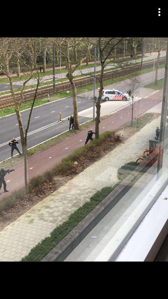 Pfoe, als de politie en antiterreureenheiden zo vlak bij je appartementencomplex (of zelfs hetzelfde complex) iets onder schot houden zou ik niet continue bij het raam gaan staan...