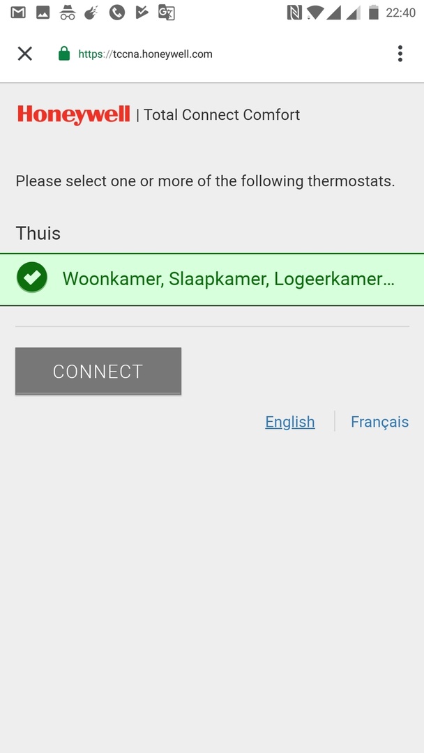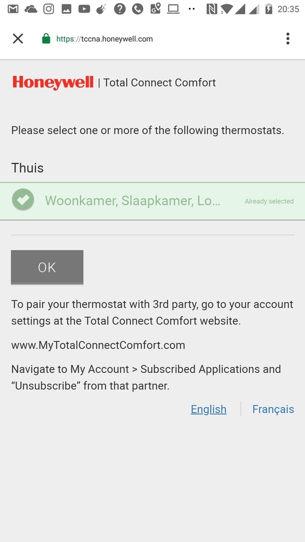 Mijn thermostaat wordt wel zonder problemen gezien in de app van Honeywell en door Homey. De andere apparaten in Google Home leveren geen problemen op. Wat wel opmerkelijk is, is dat in het proces van koppelen het volgende wordt gezegd: