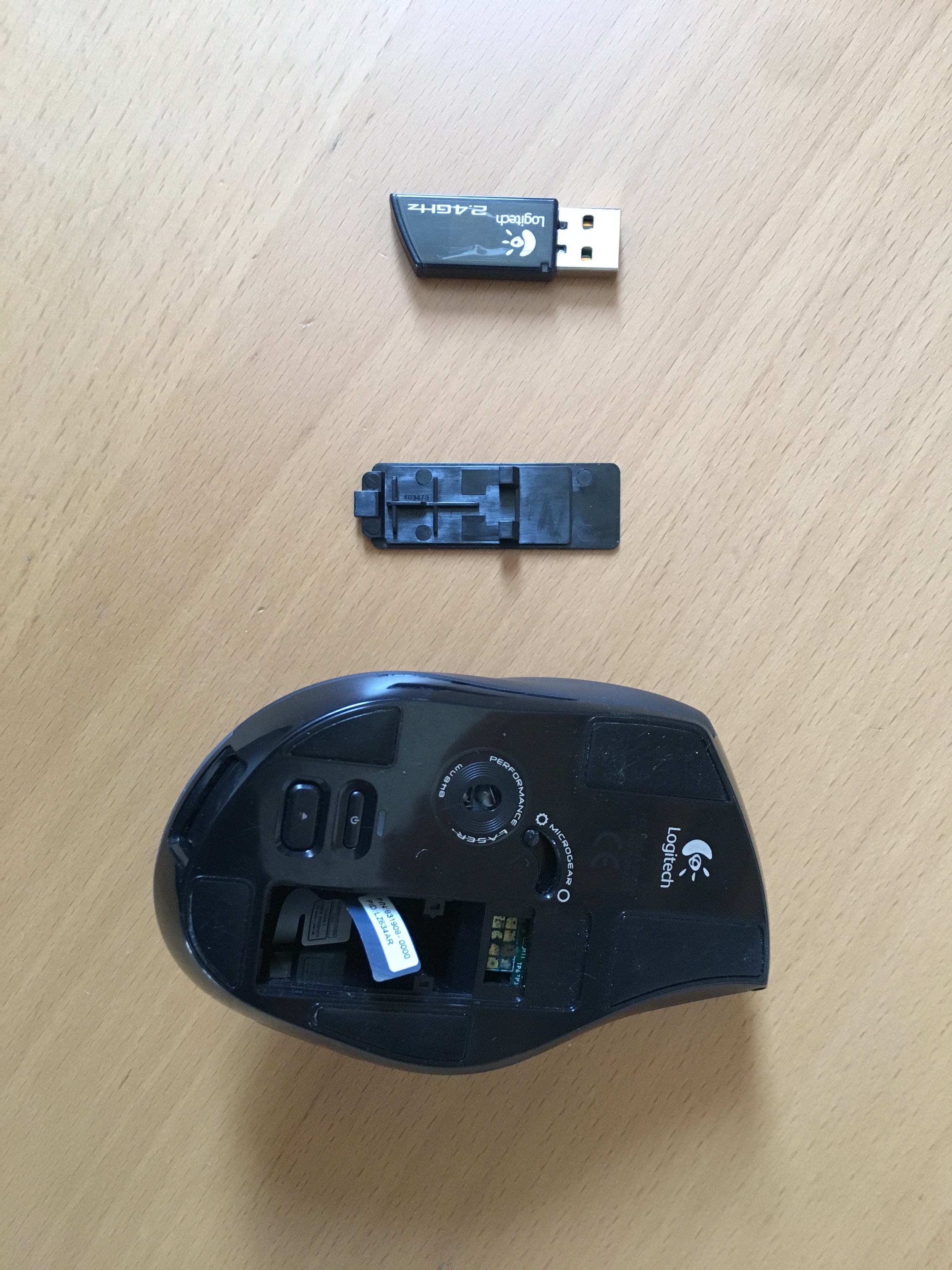 In verband met de revalidatie na een handoperatie wil ik voor mijn laptop weer een muis gebruiken in plaats van de trackpad. Toevallig had ik een Logitech draadloze muis (geen idee welk type, hij lijkt op een M705, dus ik denk zijn voorganger) liggen en die heeft altijd perfect gewerkt.
