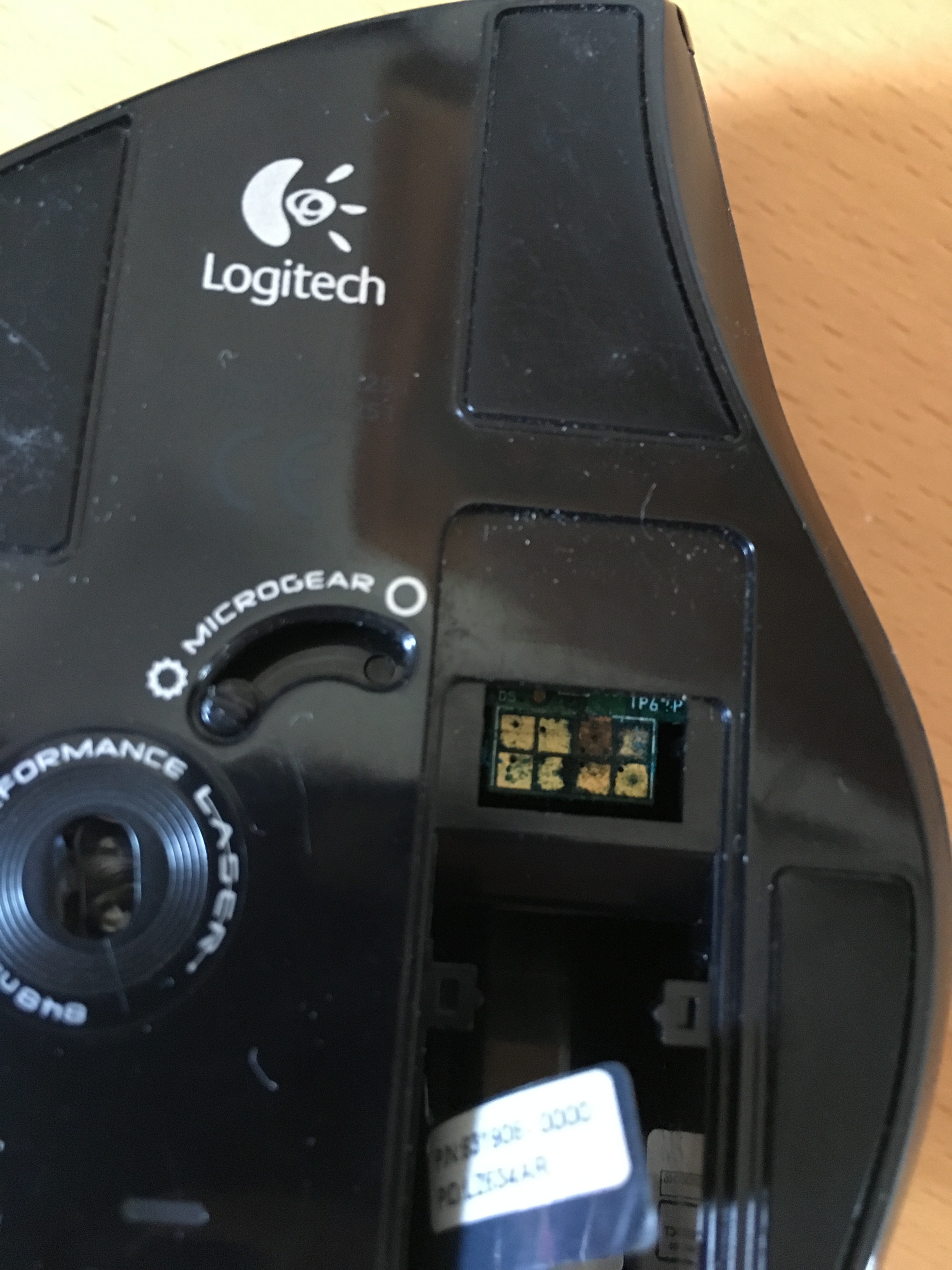 De + en - van de batterijhouder zijn verder helemaal in orde, verder is de muis ook niet gevallen en werkte hij dus van het ene op andere moment niet meer. Het viel me wel op dat op het zichtbare gedeelte van de printplaat een stukje geoxideerd is (zie foto), zou dit voor problemen kunnen zorgen? Iemand een idee hoe ik dit kan verhelpen/schoonmaken?