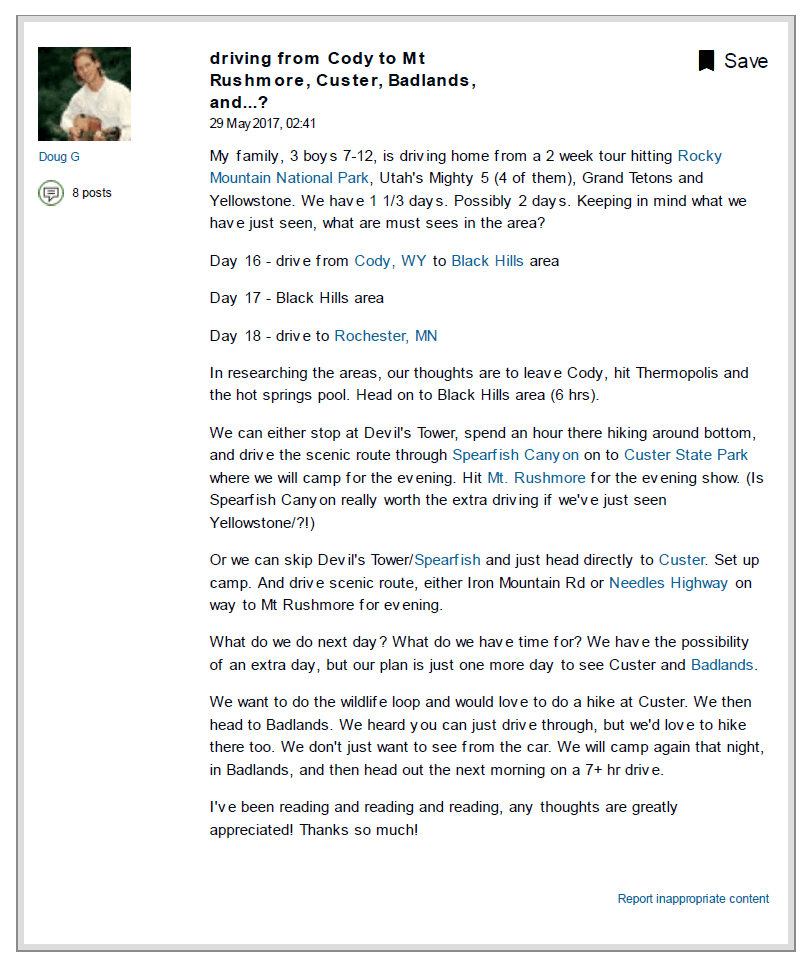 Niet een super ervaring met zulke zaken zoals Devils tower en Deadwood zaken gehad helaas, maar de fotos die je laat zien, zien er wel echt mooi uit en zit de dag inderdaad helemaal vol. Ik ga hier sowieso verder onderzoek na doen en misschien toch die route pakken. Via het zuiden heb ik 1 plek om te bezoeken en deze route veel meer. Deadwood is dat niet te toeristisch gemaakt? Misschien dat ik dat wel over sla en dan liever langer in Spearfish Canyon blijf