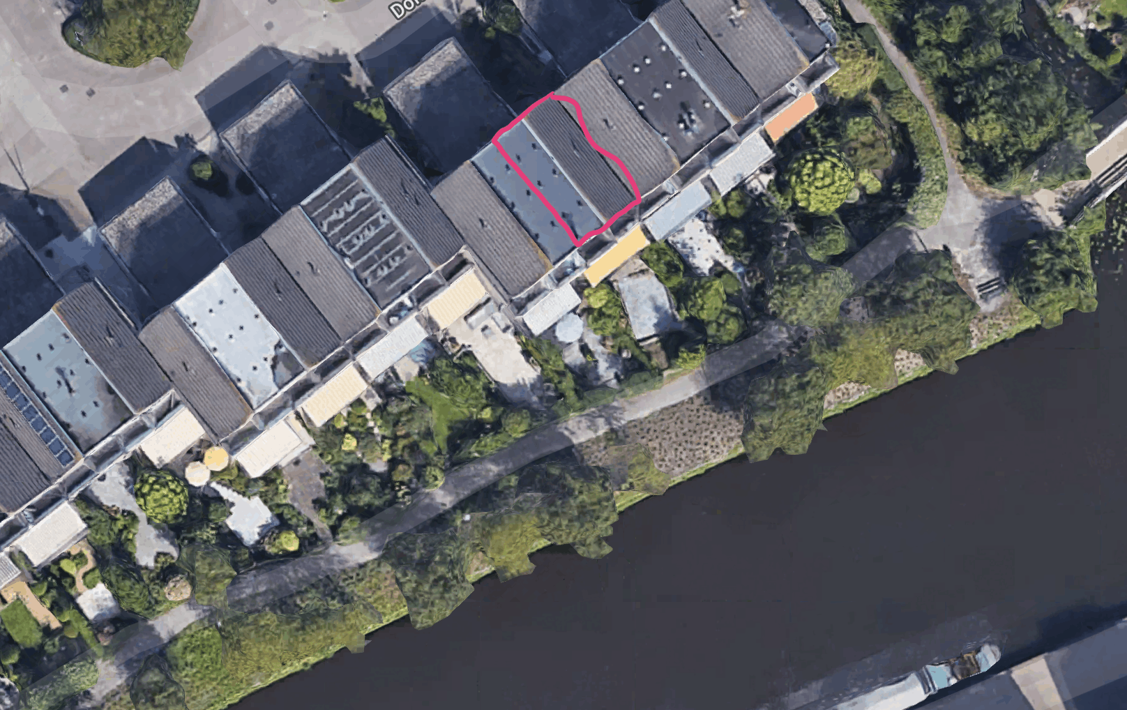 Schuin dak op NO waarop fysiek 2 rijen van 8 panelen in portrait zouden kunnen liggen, met aftrek van 1 paneel voor een afvoerpijp van de mechanische ventilator. Hier zal ik in ieder geval een korter exemplaar voor plaatsen, zodat de invloed van de schaduw zoveel mogelijk wordt beperkt. Daarbij blijft dan aan de onderzijde een strook van ca. 1 m1 dakoppervlak onbenut.