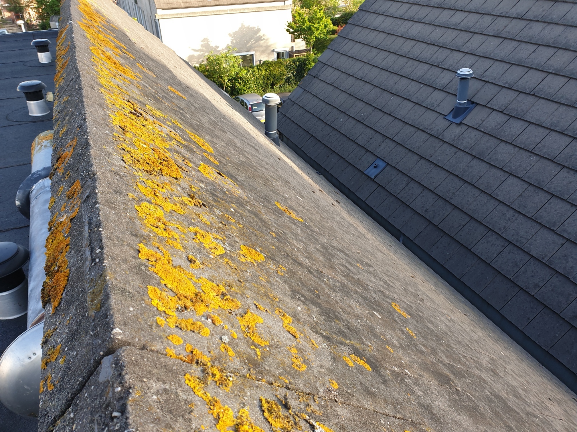 Daarnaast nog een stuk platdak op ZO wat we delen met de buren, tussen de opstanden 9m lengte en 2m30 breed waar ik zelf in principe vrij ben om al dan niet iets te plaatsen. Daar zitten nog wat pijpjes op voor de ventilatie van de luchtspouw van het koude dak, maar die kunnen ook lager worden gemaakt of verplaatst als ze in de weg zouden zitten. Het schuine deel van het dak loopt door, met een rand van 1 m1 hoog tot gevolg.
