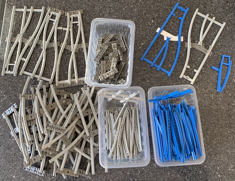 En grotere onderdelen zitten er sowieso niet extra in. Behalve dan bij een trein waar je maar 2 van de 3 wielen uit een zakje gebruikt