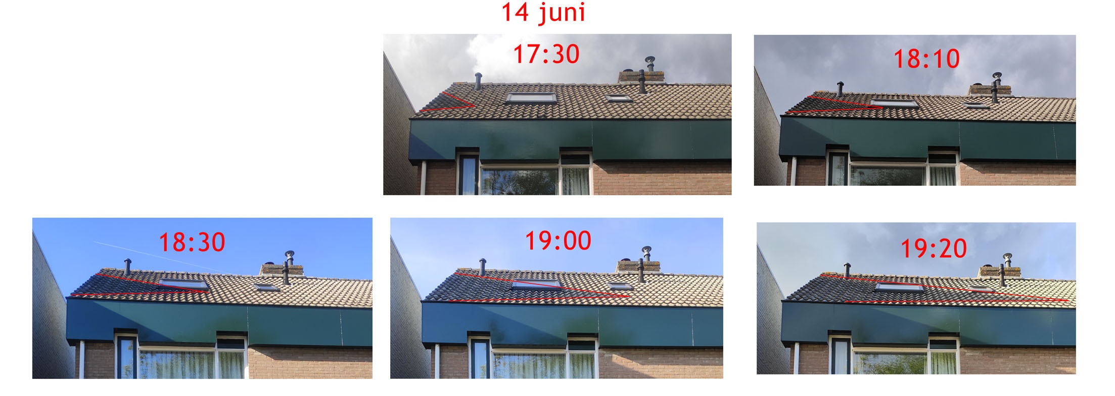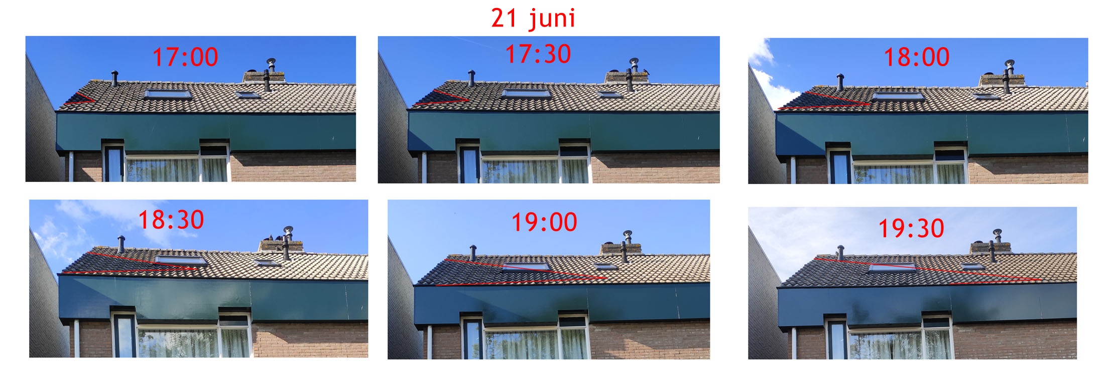 Het dak waar ik de panelen wil gaan plaatsen ligt op ZZW, ik denk op ongeveer 200 graden. De hellingshoek is ongeveer 40 graden. Het mooie is dat ik op een hoek woon, het vervelende is dat er een flat naast staat. Deze is gelukkig niet zo hoog. Hierdoor heb ik nu na 6 uur 's avonds last van schaduw. Om een idee te krijgen van de schaduw: