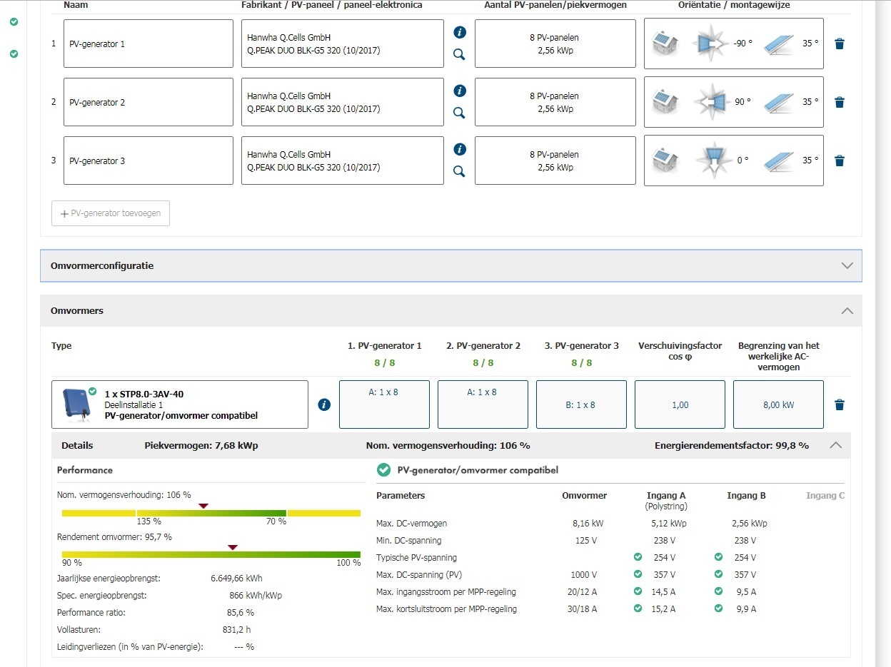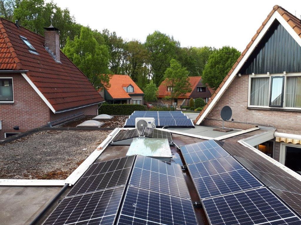 - In totaal 16 panelen (8 oost en 8 west) van het merk Qcel Qpeak duo 320wp (33,80V & 9,47A)