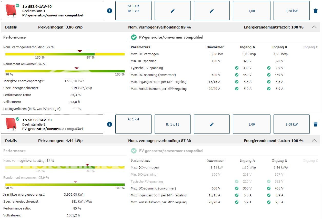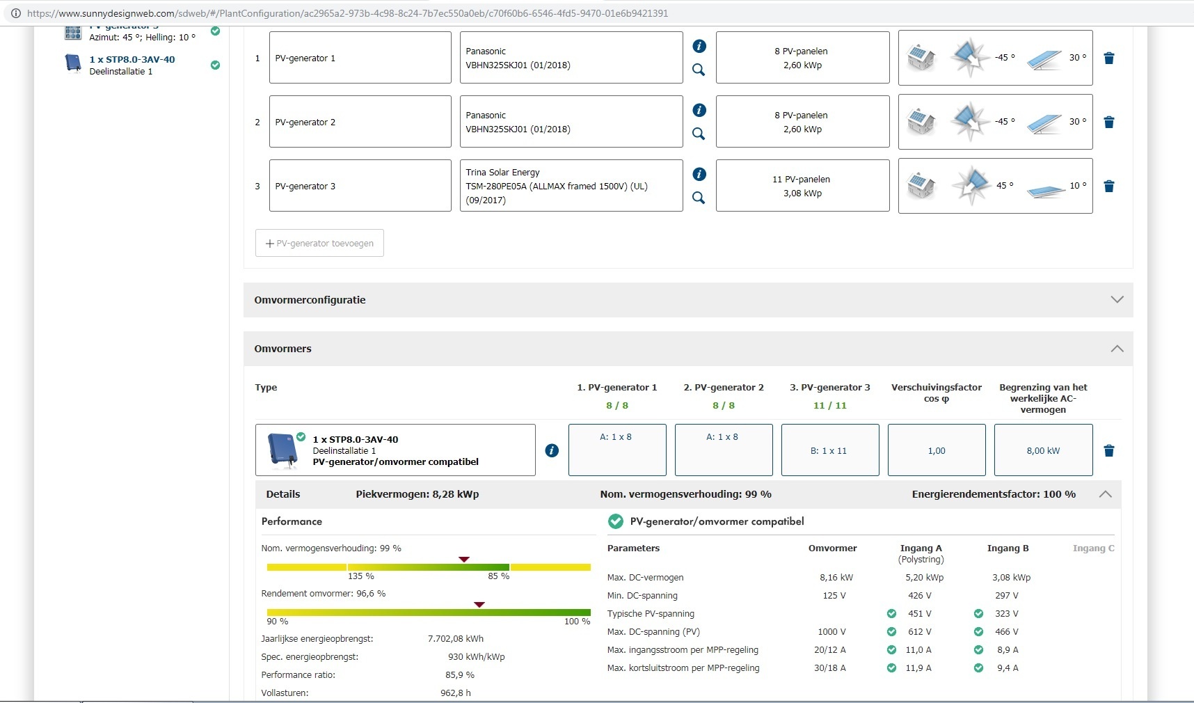 De andere leverancier gaf aan dat verschillende merken panelen in 1 string niet goed gaan en adviseert om van 2 omvormers gebruik te maken. Een 1 fase Solaredge voor de garage met en een 1 fase GoodWe voor het keukendak. Dit omdat de 1 fase Solaredge met P404 al opstart met 6 panelen ipv 13/16 panelen op 3 fase. Gezien de schaduw aan het begin van de dag zou dat beter zijn.