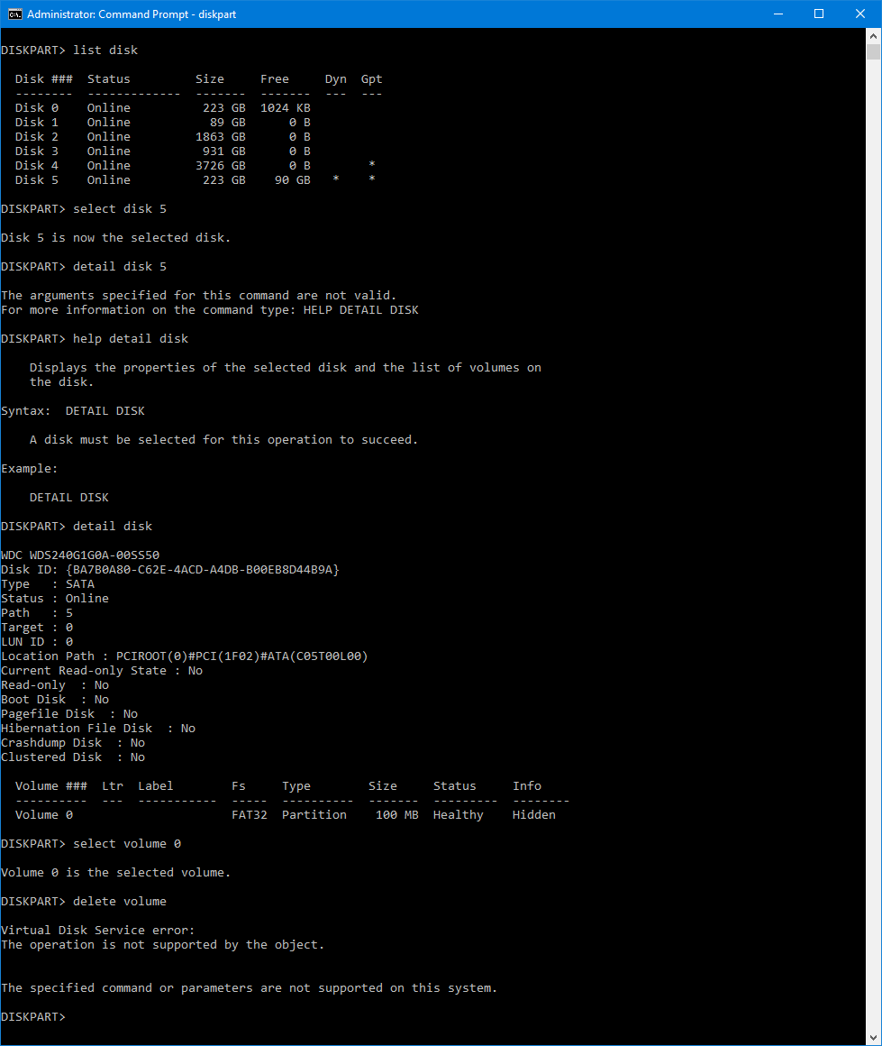 Via diskpart krijg ik de schijf ook niet leeg: [Afbeelding: diskpart1]