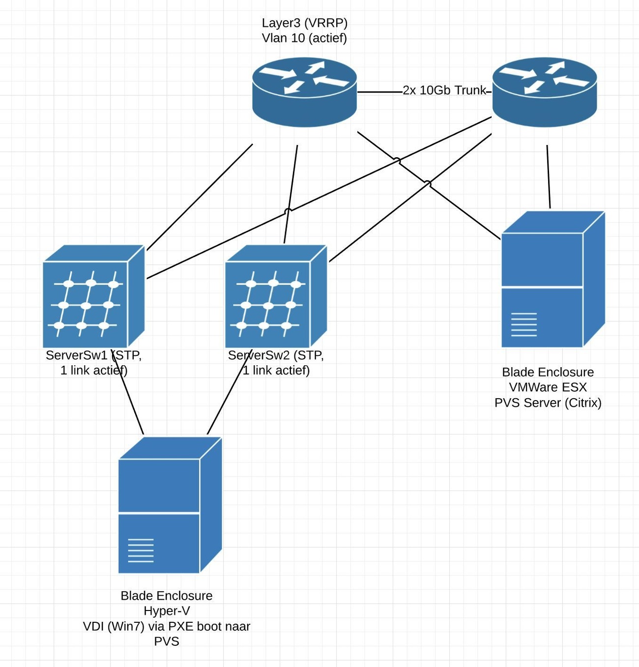 Het blade enclosure hangt met een soort STP aan de beide serverswitches. Op de Hyper-V/ESX hosts zijn er 2 NIC's die via de MS/VMware software geteamed zijn, er vind dus para virtualisatie van de netwerkkaart plaats en het OS doet failover.