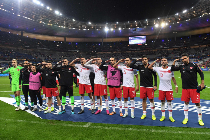 Er wordt heel vaak met veel meel in de mond gesproken over het niet politiseren van sport, maar wanneer despoten als Erdogan en hun (bewust dom gehouden met veel indoctrinerende propaganda) voetvolk en 5e colonne (denk aan de Duitse Turken) dit soort vertoningen organiseren - spontaan is het uiteraard niet - dan kan dat vrijwel zonder consequenties.