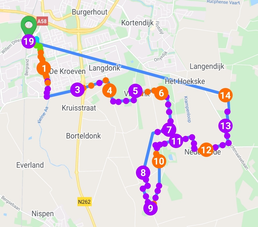 Hier mis ik helaas enkele tussenpunten op mijn route, oa tussen 7 en 8, 9 en 10, en natuurlijk het stuk van punt 14 naar huis..