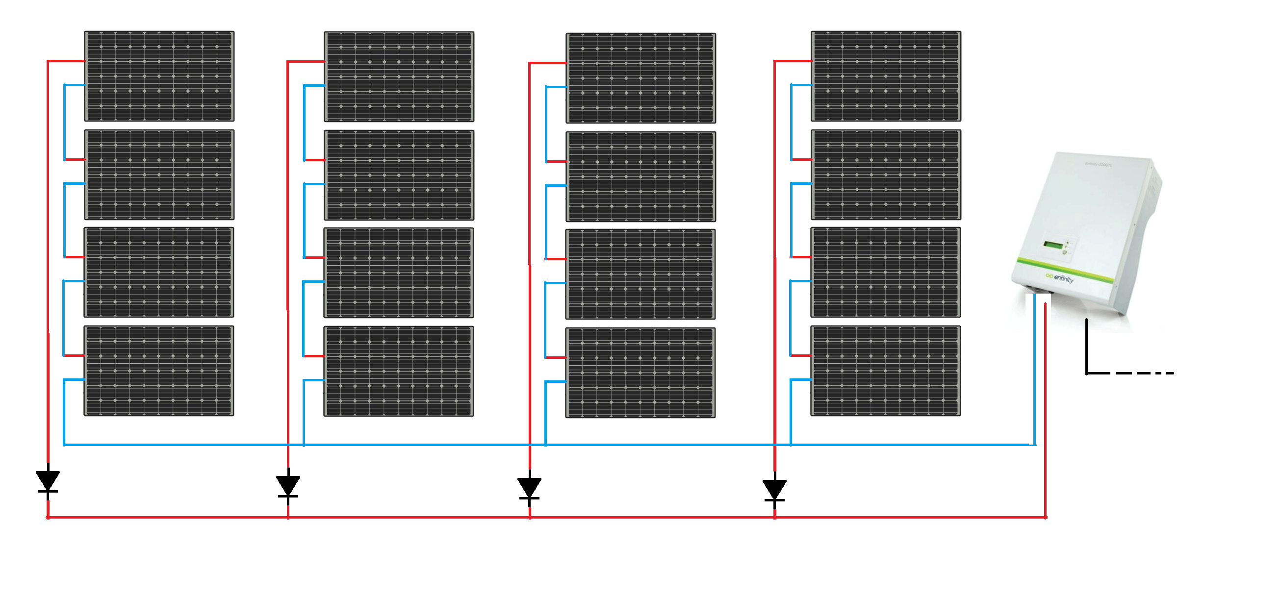 Ik heb 16 panelen, ik zet ze met groepjes van 4 parallel, vervolgens deze groepjes weer in serie.