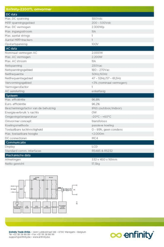 Met 16 panelen in serie kom ik op 1248Vdc open spanning (16x78V), dit lijkt me wat veel voor de Enfinity die een max dc ingangsspanning heeft van 550V.
