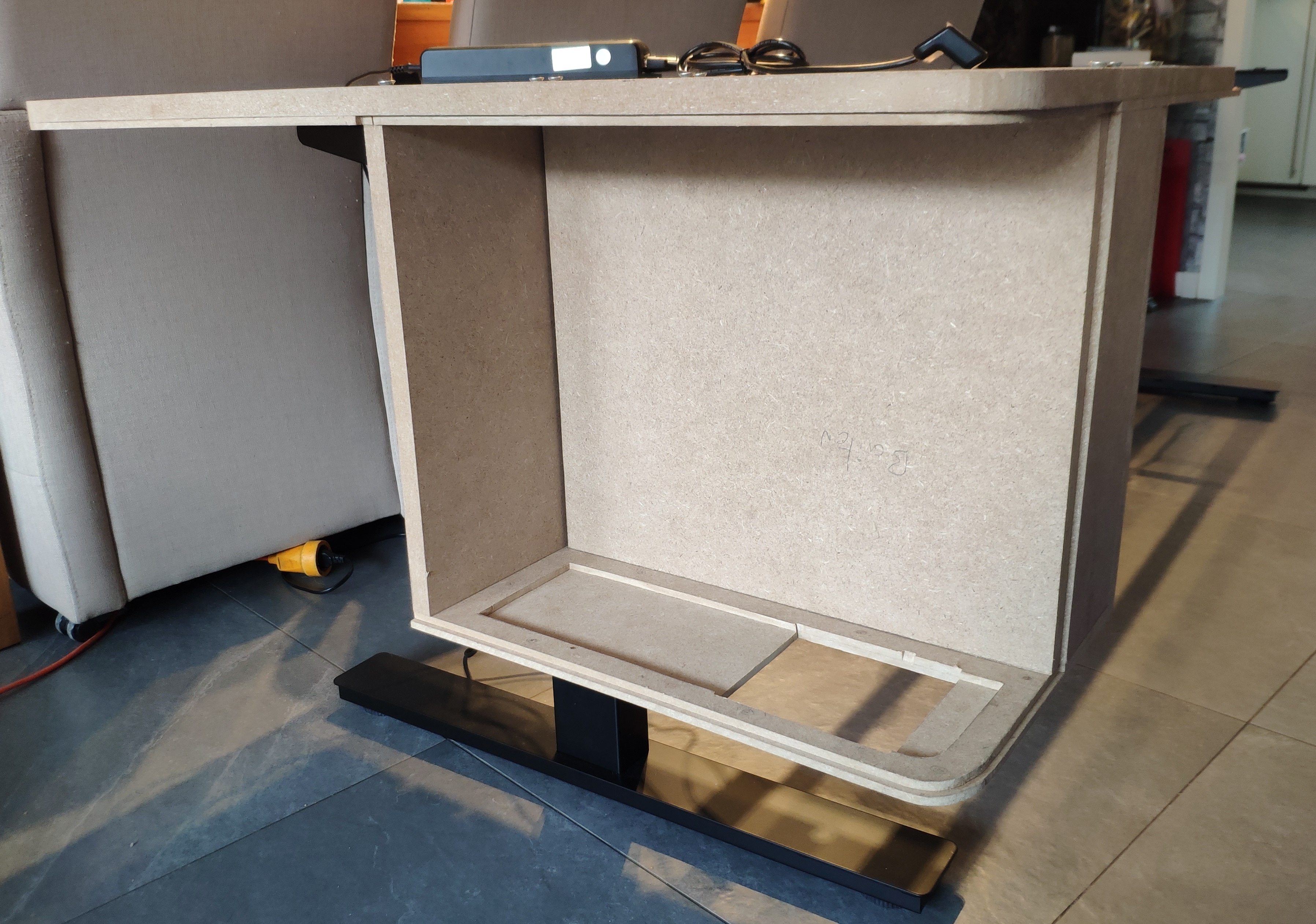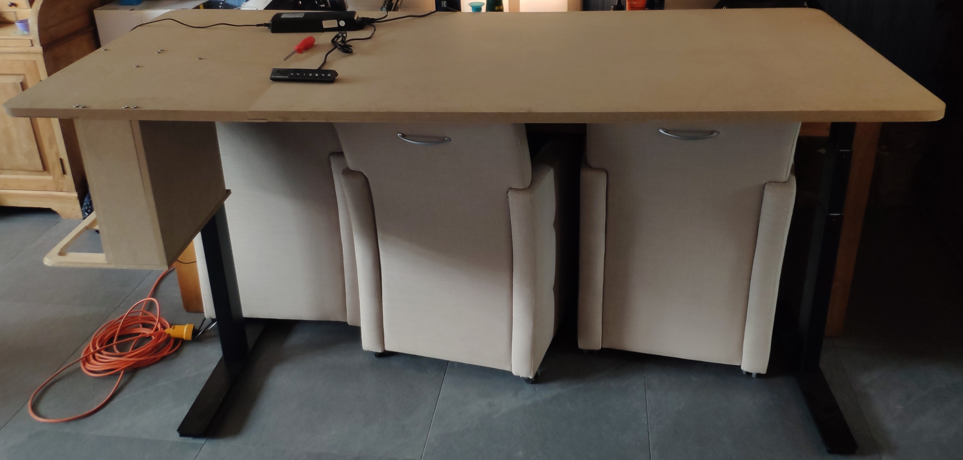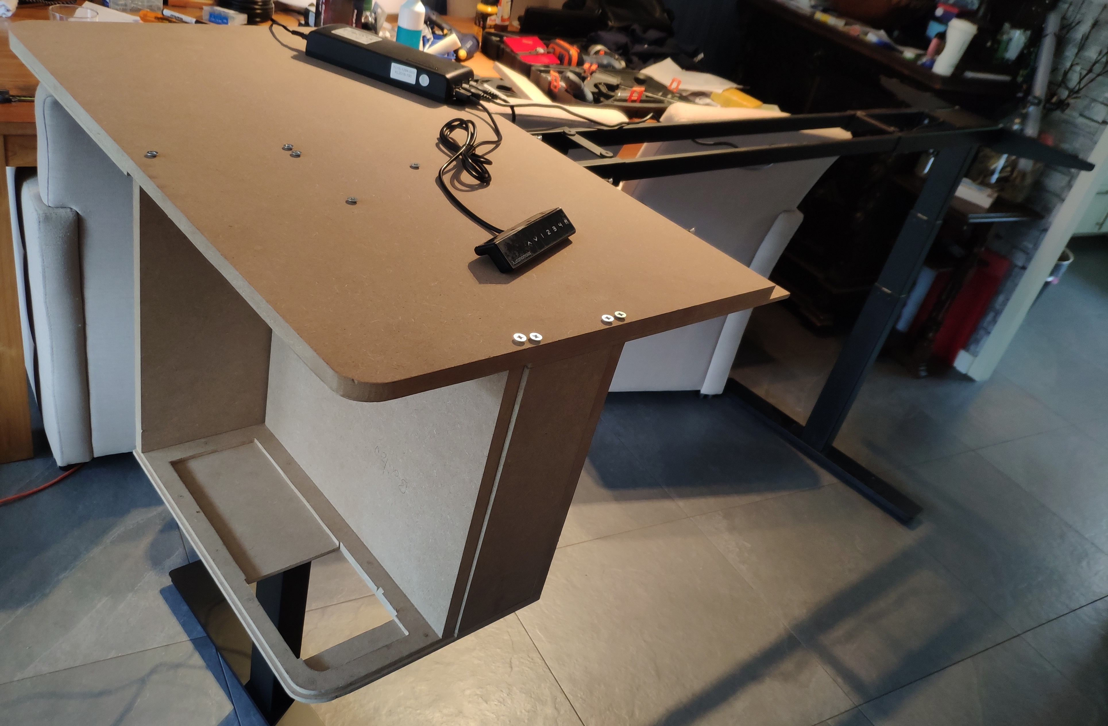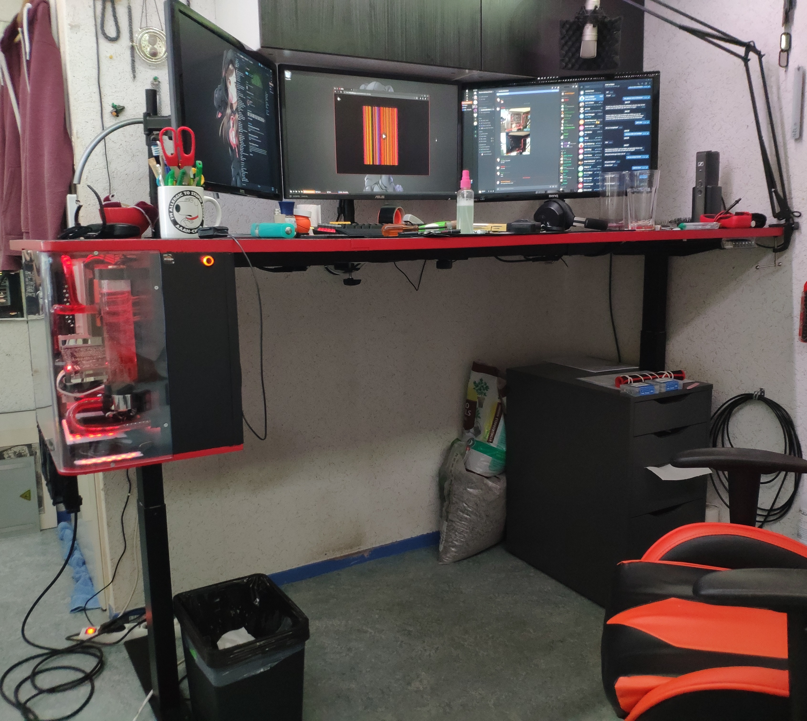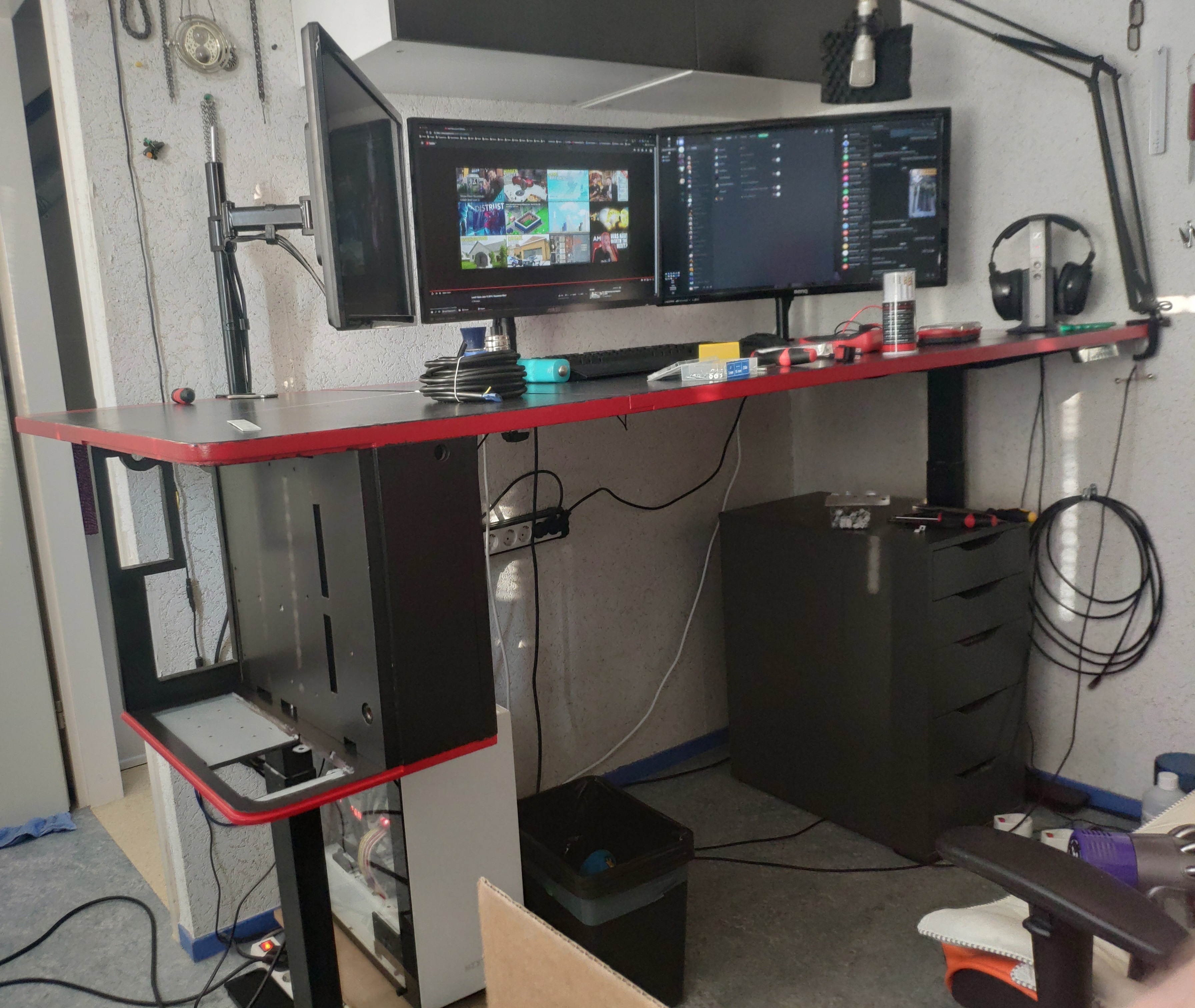 De eerste foto van het systeem op z'n plek, links onderin zie je de oude pc nog staan. Het onderstel wat je ziet is een Autonomous-AI Smart Desk 2 DIY kit