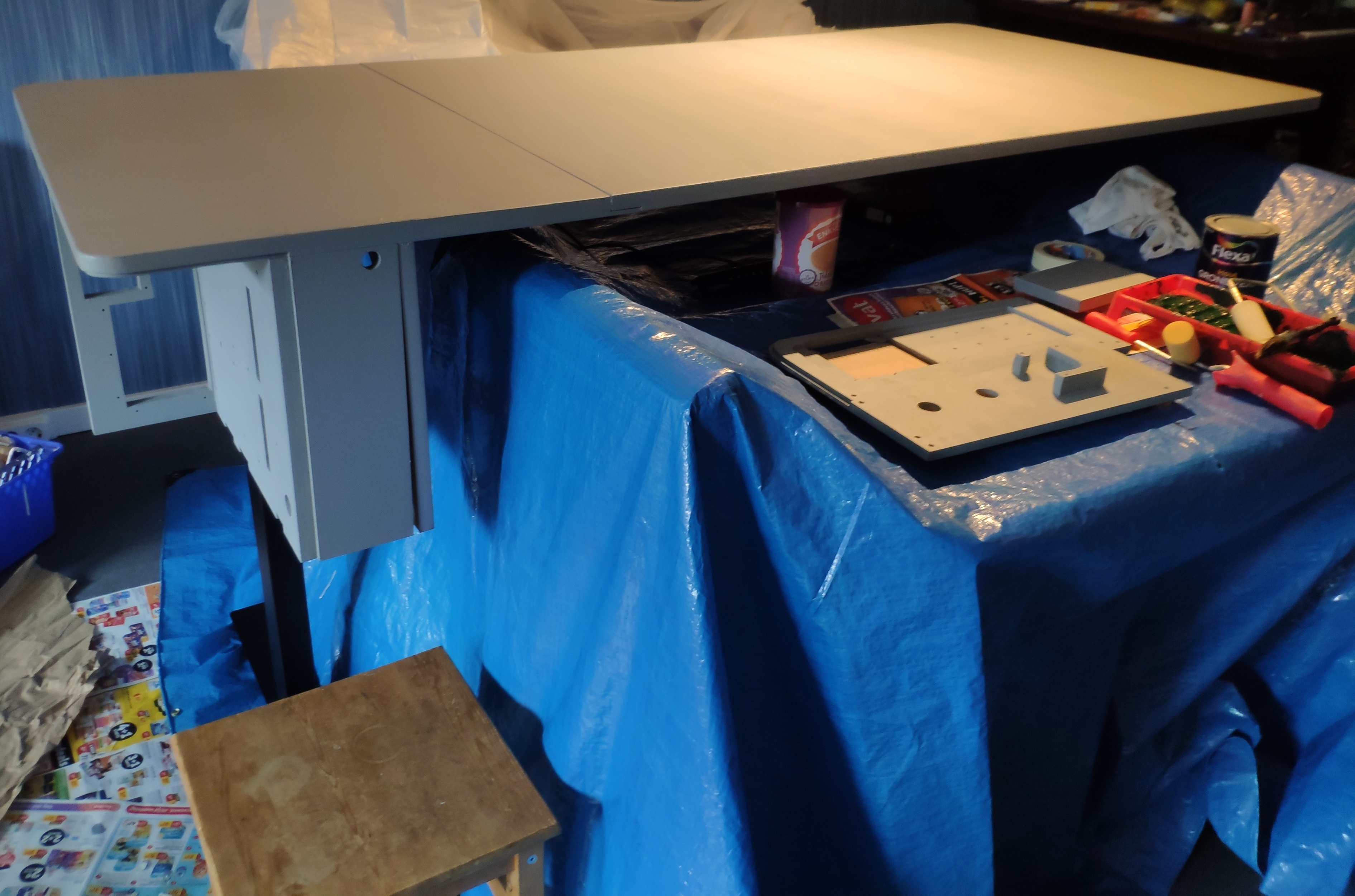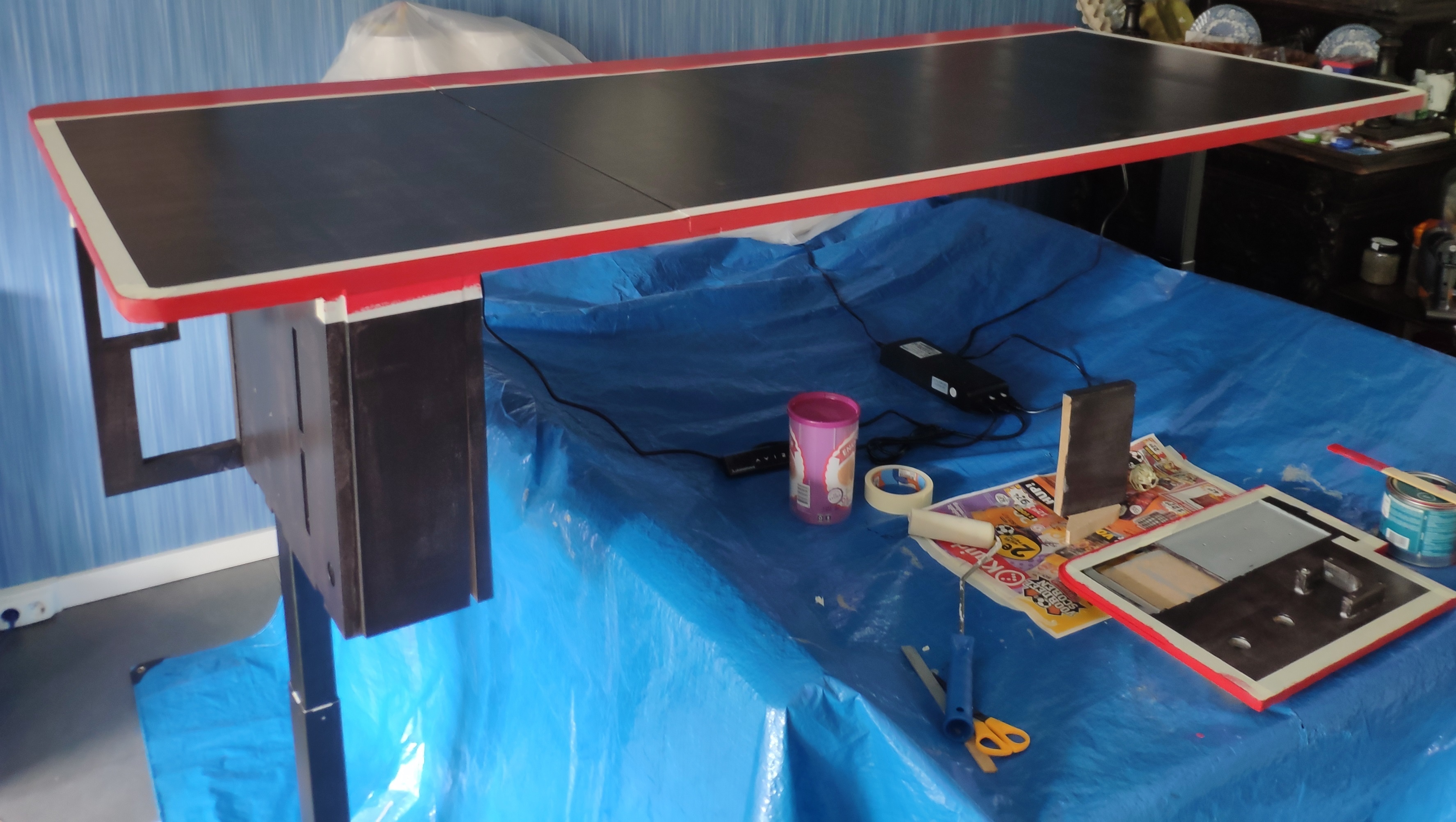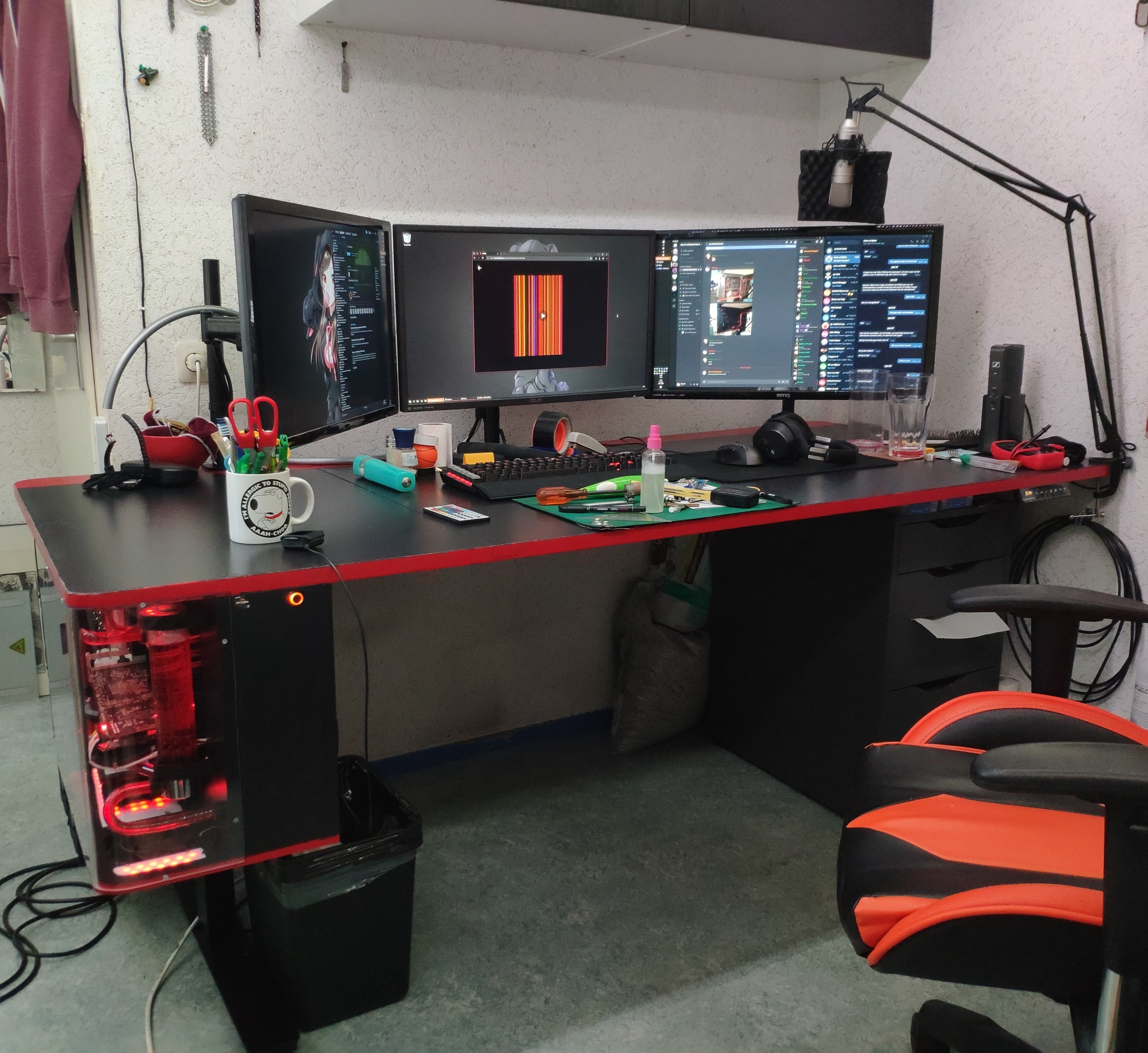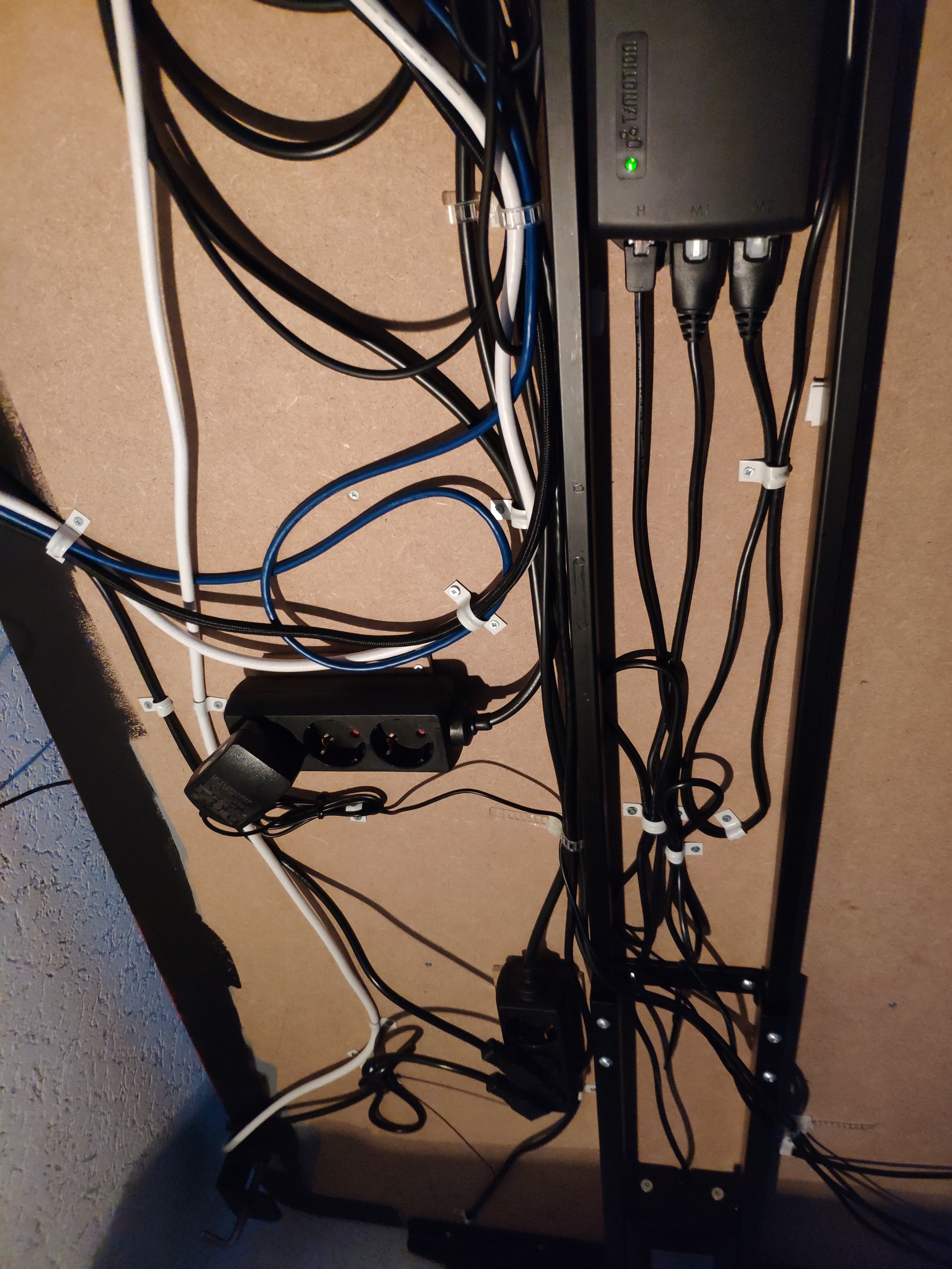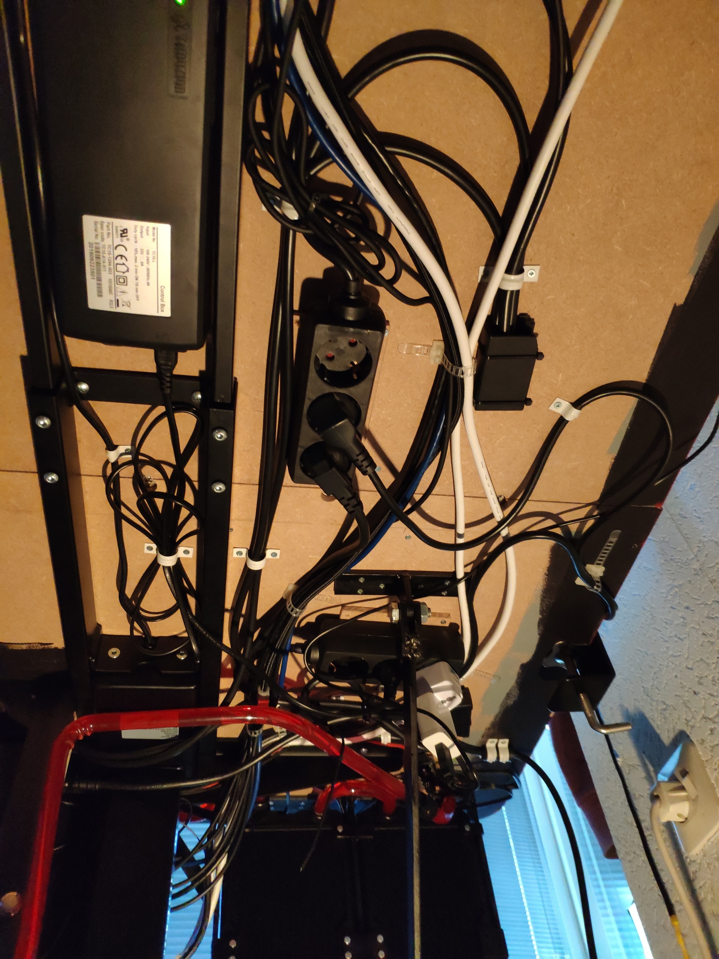 De eerste foto van het systeem op z'n plek, links onderin zie je de oude pc nog staan. Het onderstel wat je ziet is een Autonomous-AI Smart Desk 2 DIY kit