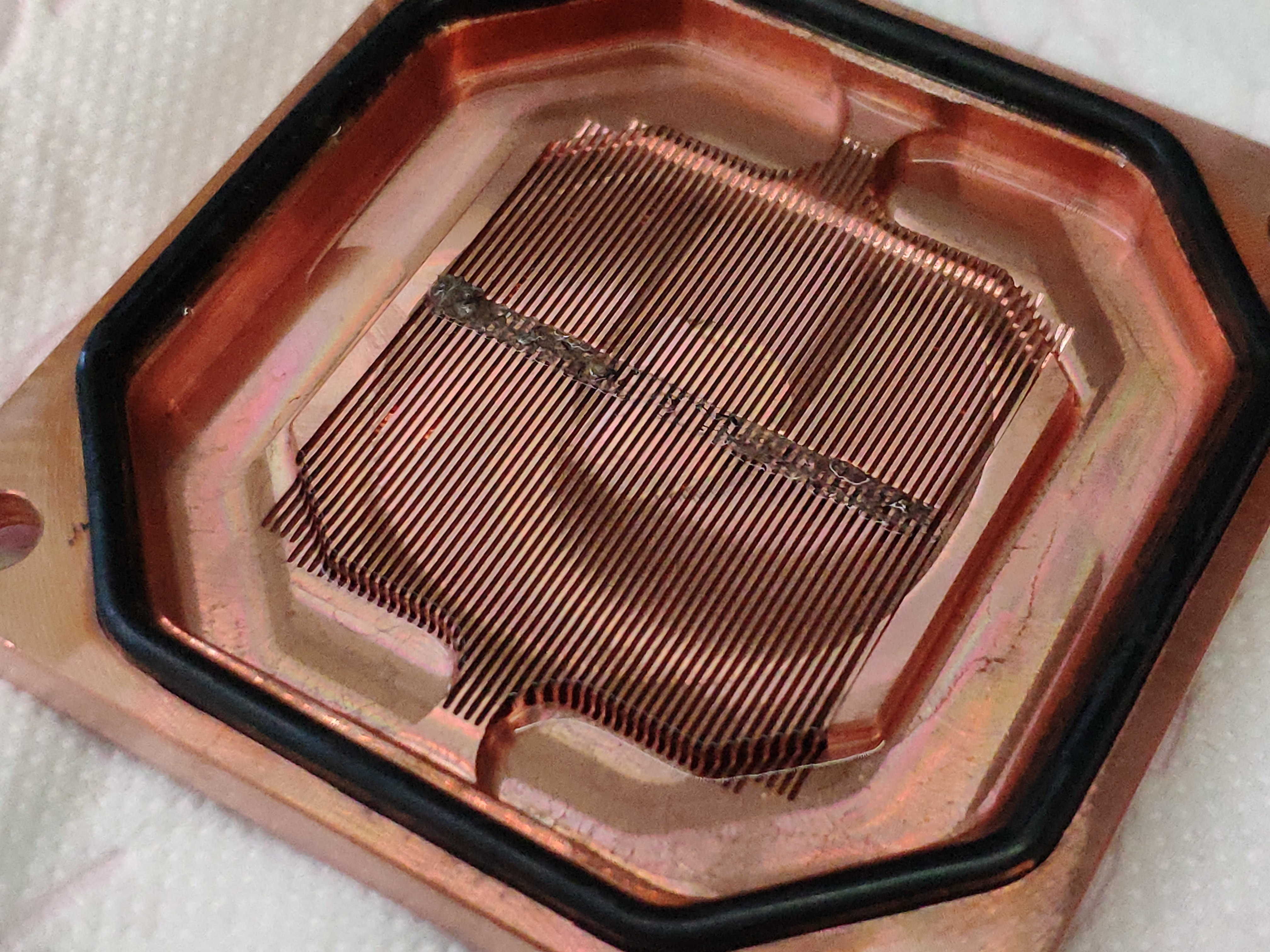Het leek er op dat er wat viezigheid in het cpu-blok terecht was gekomen dus die had ik nog even open gemaakt, en jahoor! Dus dat schoon gemaakt en terug de build in.