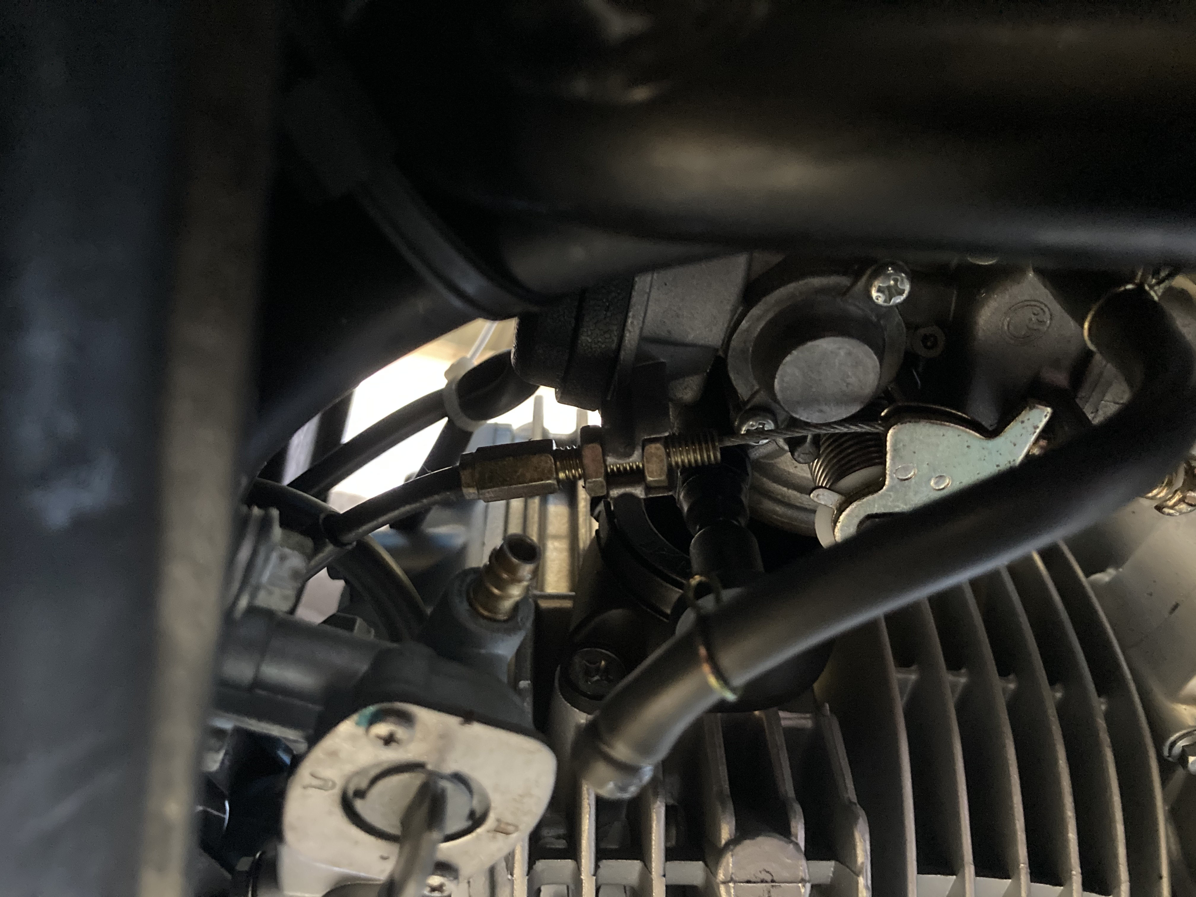 Het gaat om dit systeem maar de tekening maakt het niet echt duidelijk. Ik vond foto's van andere carburateurs zijn met zo'n systeem (klik, dit is dus niet voor deze motor en het lijkt erop dat enkel het kabeltje los moet kunnen(?) en de springveer e.d. in z'n geheel op de carburateur blijft.