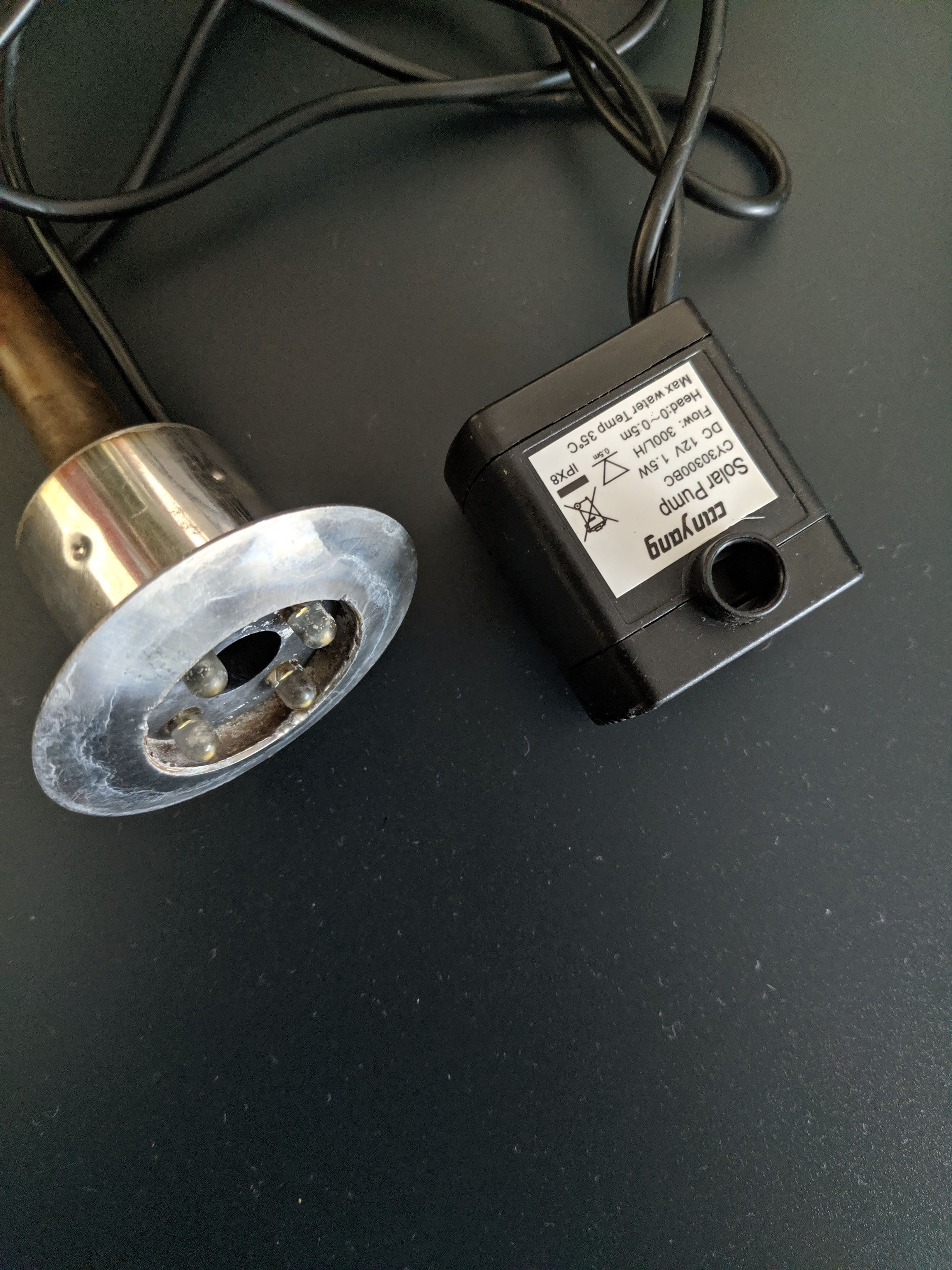 Ik wil dus van 240v naar 12v. De 12v komt voort uit het feit dat de waterpomp (waar een draadje in gaat, en een draadje uit naar de 4 ledjes), 12v en 1.5W vraagt. Deze wil ik graag op de Sonoff aansluiten, maar dan moet er ergens ook nog een waterdicht verloop tussen. Hier heb ik naar gezocht, maar deze heb ik nog niet kunnen vinden (behalve voor een euro of 50, maar dat is dan weer net even iets te gek).