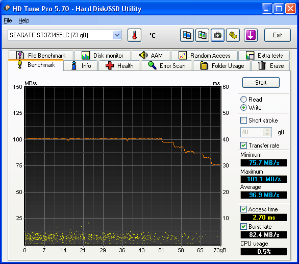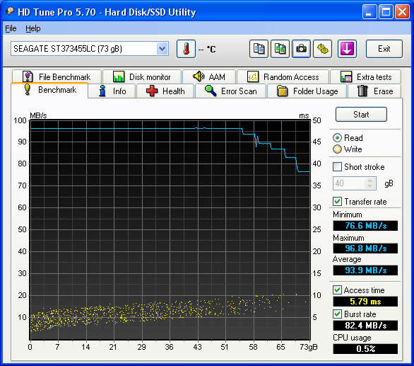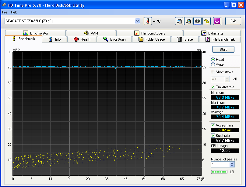 Overal op de schijf is de snelheid rond de 70mb. Normaal hoort de snelheid altijd langzaam naar beneden te lopen. Deze schijf moet wel boven de 100mb kunnen aantikken volgens reviews op internet. Mijn adaptec moet 160 mb aan kunnen volgens de site https://storage.microsemi...ort/scsi/u160/asc-29160n/