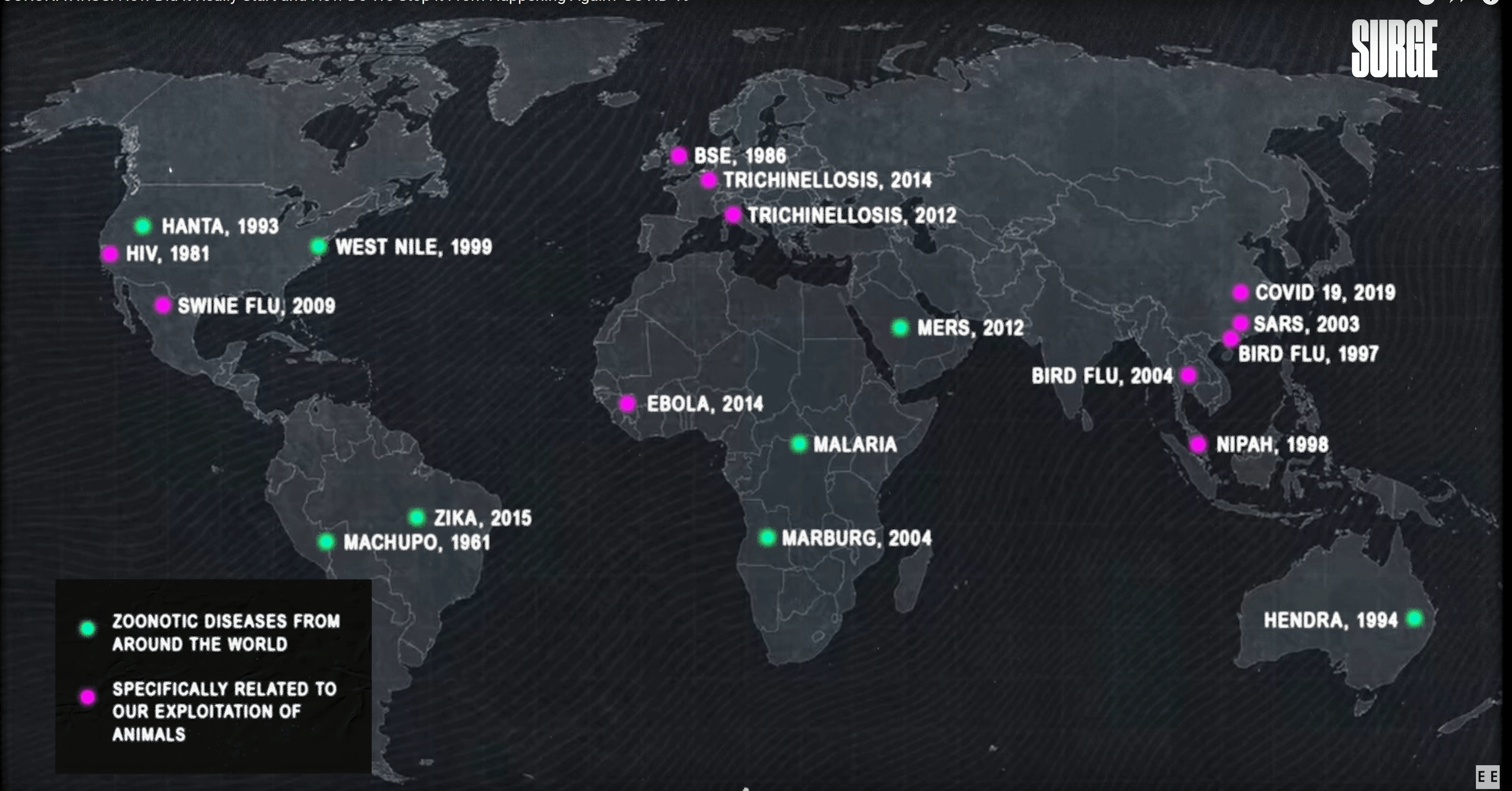Instead it was because 'the exploitation of animals creates environments where the likelihood of spillovers occurring is significantly increased, and if we weren't using animals for food we wouldn't have created situations where many of these diseases, including the latest coronavirus, were passed to humans'."