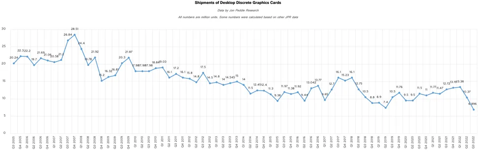 En elke keer als mensen het niet accepteren, betekent het ook dat de installatiebasis voor nieuwe GPU's krimpt waardoor het hele punt van PC gaming, de grotere technische capaciteiten, minder aantrekkelijk worden voor game developers om iets mee te doen. GPU verkopen dalen al iets van 15 jaar gestaag. Dat komt mede omdat videokaarten nu eenmaal duurder moesten worden omdat ze (veel) duurder zijn geworden om te maken. Maar de trend van de laatste paar jaar is helemaal bruut. Zonder mining lijkt het erop dat het niet eens 10 miljoen per kwartaal meer is. Daarbinnen is maar een beperkt percentage hoger segment waar meer geavanceerde games ook mee functioneren.
