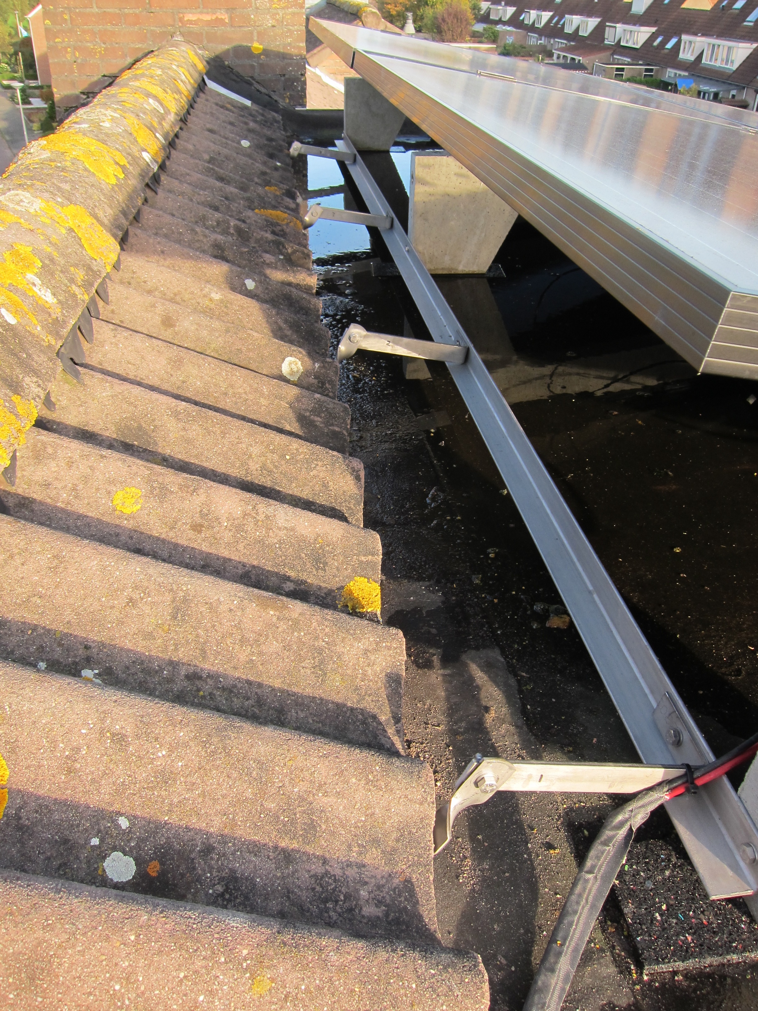 Een andere optie welke ik in gedachte heb is plaatsen in portrait modus en dan 5 stuks naast elkaar. Qua breedte kom ik dan op ong 500cm en diepte 169cm. Dan heb ik 6 betonvoeten nodig. Deze opstelling maakt het nog wat makkelijker om over het dakkapel te kunnen lopen om de panelen schoon te maken.