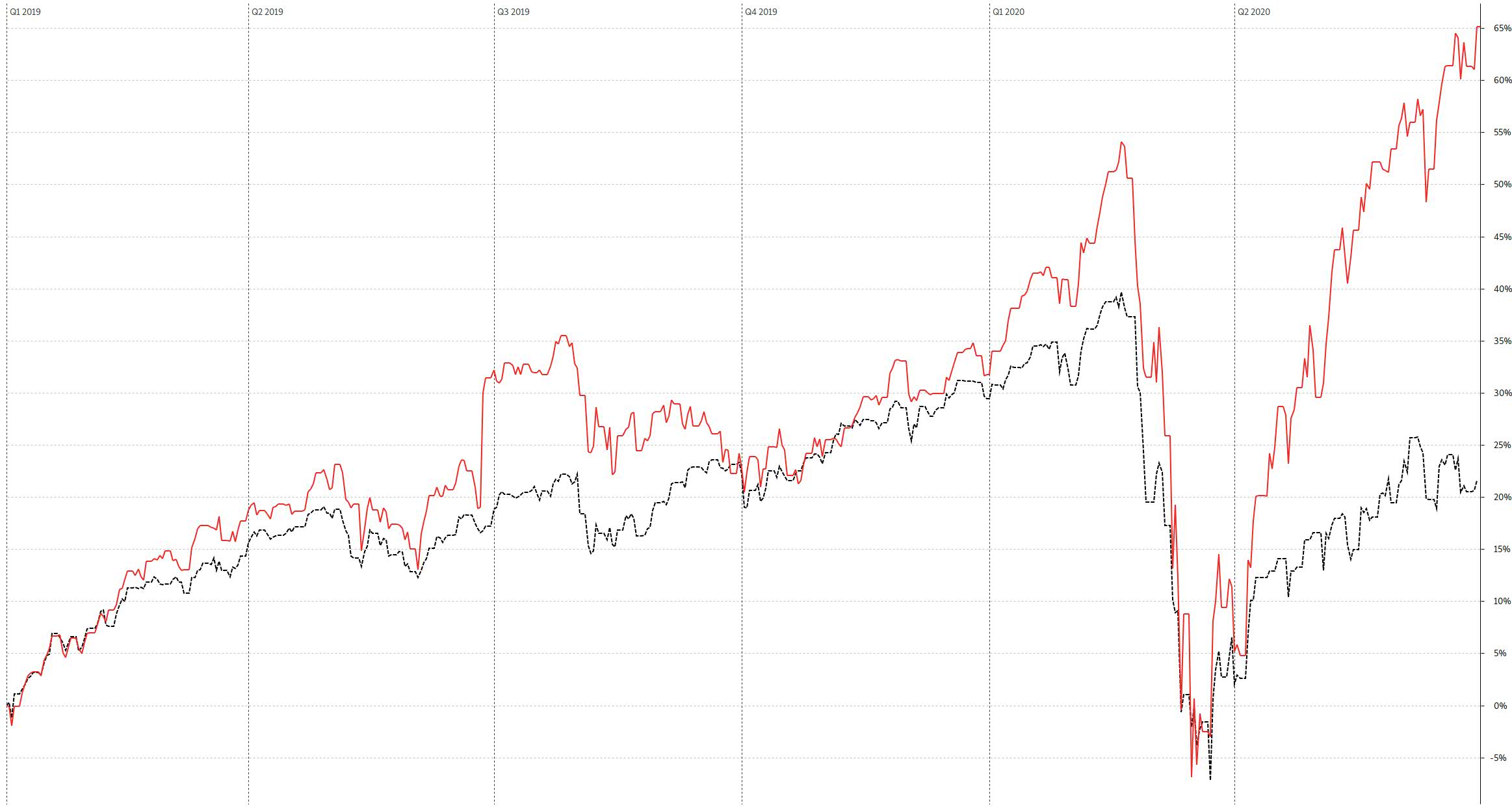 Net als vorige maand blijft de winstkoning SHOP maar winnen. Twee maanden geleden stond het op +352,16%, vorige maand op +434,52% en deze maand op +561,83%. Verder stijgt DOCU ook door en behoudt wederom zijn tweede plaats met +344,23%. Vorige maand stond MELI derde, maar deze maand heeft FSLY deze plaats overgenomen met +271,46% (tegen +216,78% van MELI).