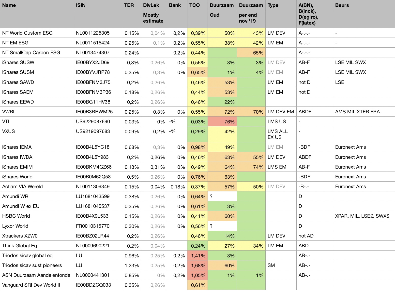 Hier ter referentie en zonder garantie mijn tabel met info over fondsen, kosten en duurzaamheid (morningstar). Niet alle info is helemaal compleet. grijze dividendlekken zijn schattingen op basis van soort fonds en andere gegevens. Broker beschikbaarheid alleen voor degenen waar ik toen naar keek, en mogelijk ook onvolledig. Use at your own risk!