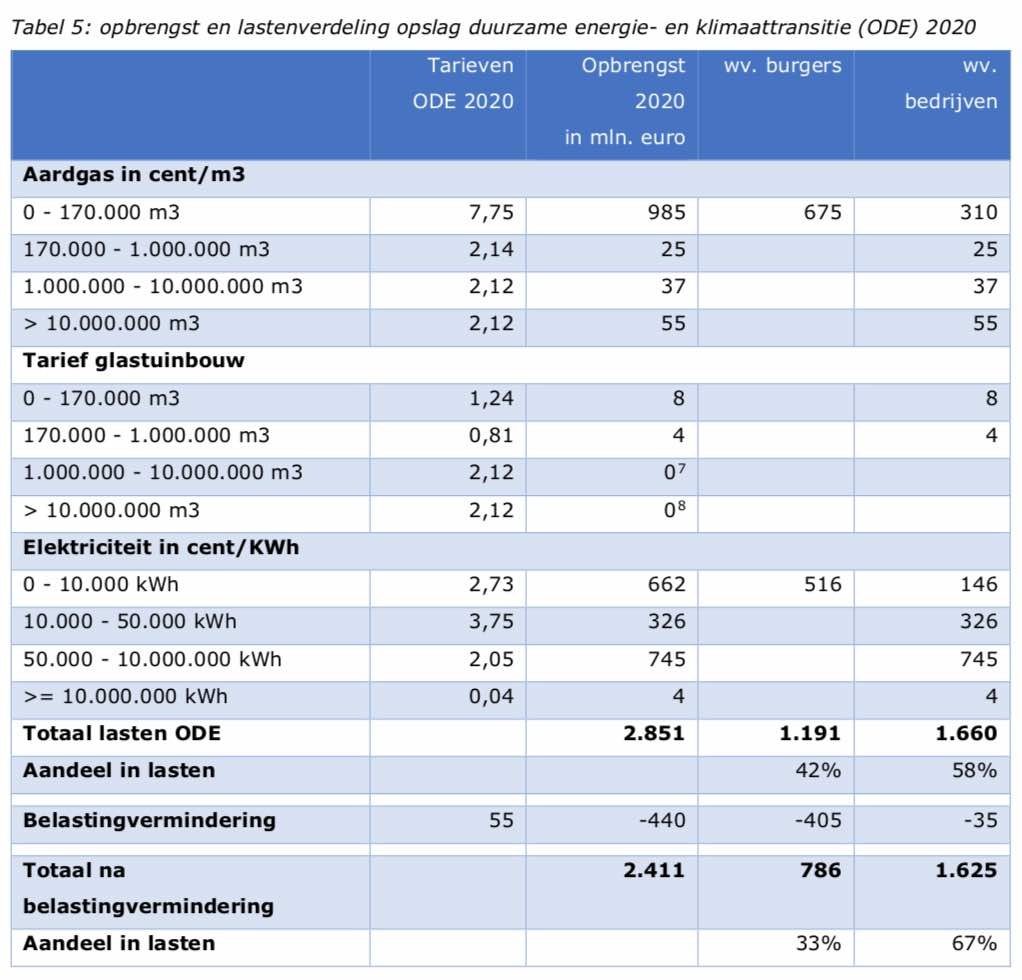 3.2. Opslag duurzame energie Daarnaast doet het kabinet een voorstel voor de tarieven van de opslag duurzame energie (ODE) voor 2020. Tot op heden is bij de tariefstelling van de ODE steeds het uitgangspunt gehanteerd dat de helft van de lasten neerslaat bij huishoudens, en de andere helft bij bedrijven. Het kabinet stelt nu voor de tarieven zo vast te stellen dat 33% van de lasten neerslaat bij huishoudens, en 67% bij bedrijven. Om dit te bereiken is in het Klimaatakkoord afgesproken de ODE in de 3e en 4e schijf verder te verhogen. Deze verhoging slaat neer bij grootverbruikers. De opbrengst van deze verhoging wordt gebruikt om de belastingvermindering in de energiebelasting te verhogen. Dit zorgt voor een lastenvermindering voor met name huishoudens. Per saldo resulteert dit in de beoogde lastenverdeling tussen huishoudens en bedrijven.