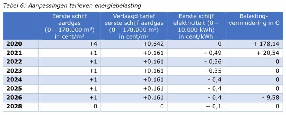 Concreet wordt de energiebelasting in de eerste schijf op aardgas in 2020 verhoogd met 4 cent per m3. In de 6 jaar daarna wordt dit tarief jaarlijks verder verhoogd met telkens 1 cent per m3.