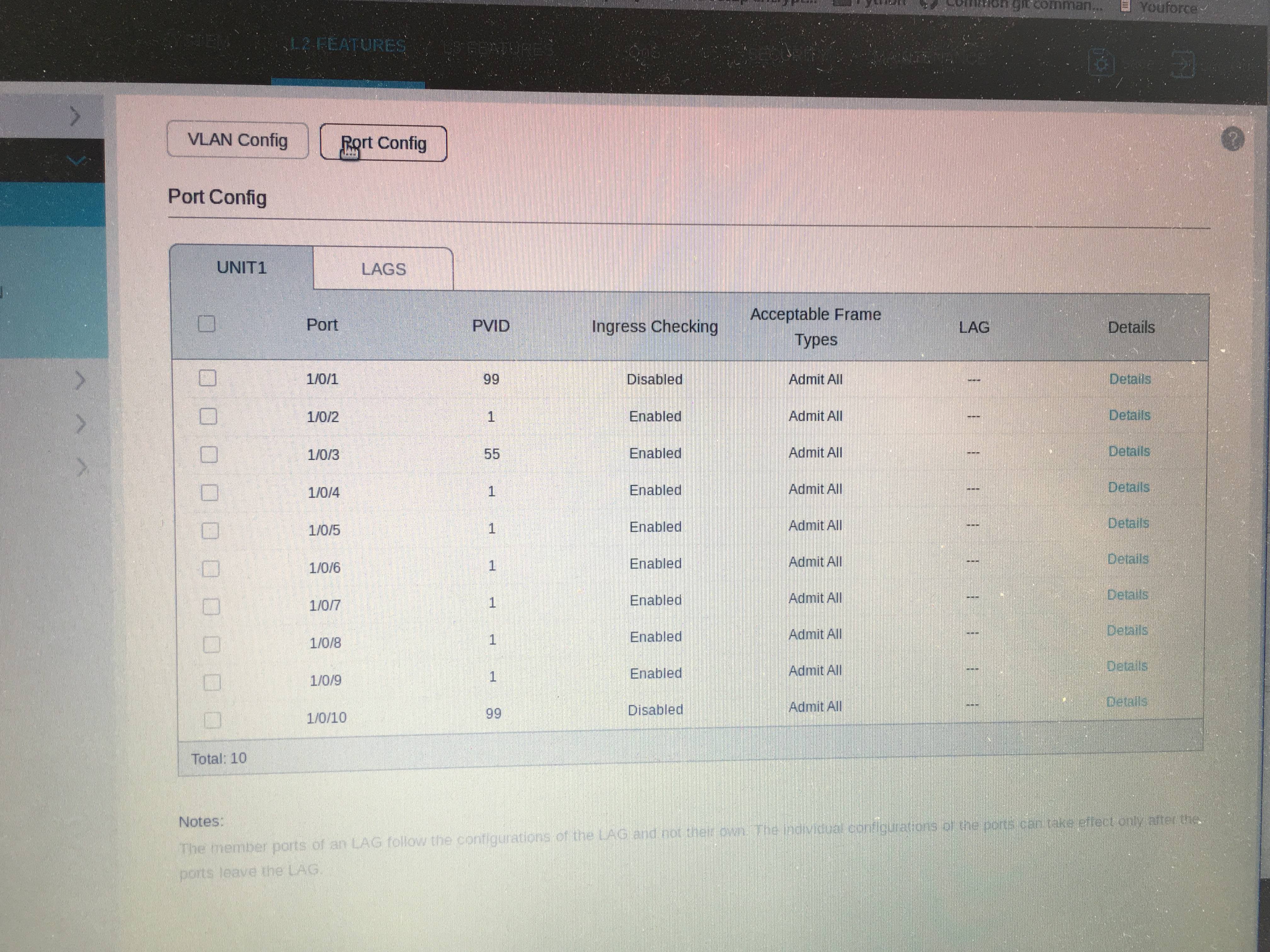 Verder verwijder ik port 1 en 10 uit VLAN 1, zodat bijv. mijn verkeer naar de switch (untagged = vlan 1) niet ook op de glasvezel uitkomt.