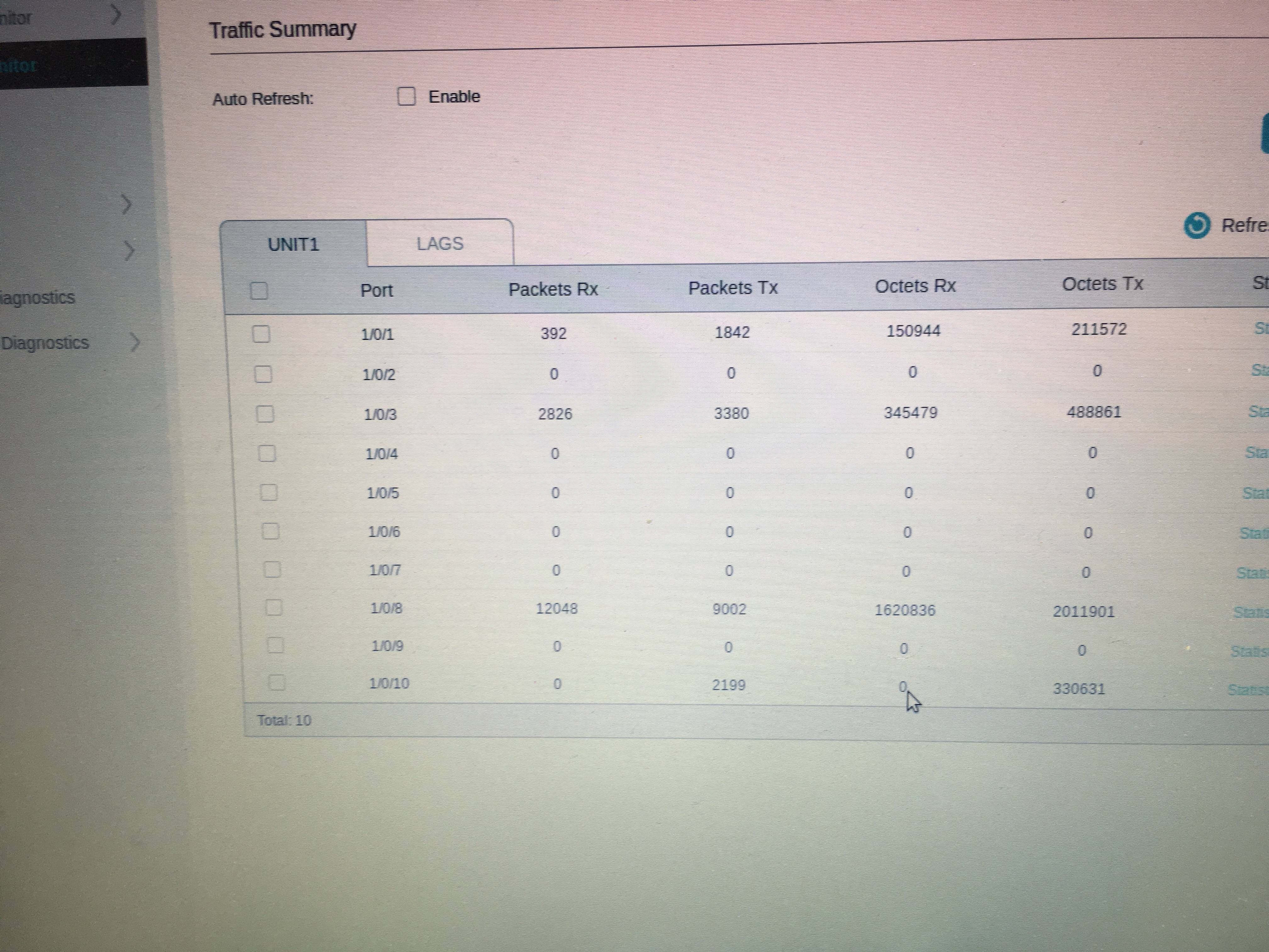 En de statistieken die aangeven dat er geen enkel pakketje is gereceived op port 10.