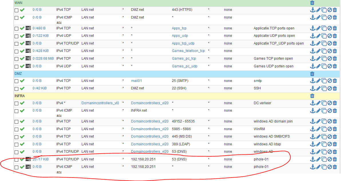 Omdat ik niet zomaar al mijn interne verkeer naar buiten wil toestaan heb ik daar ook regels voor gemaakt. Echter worstel ik met het volgende: