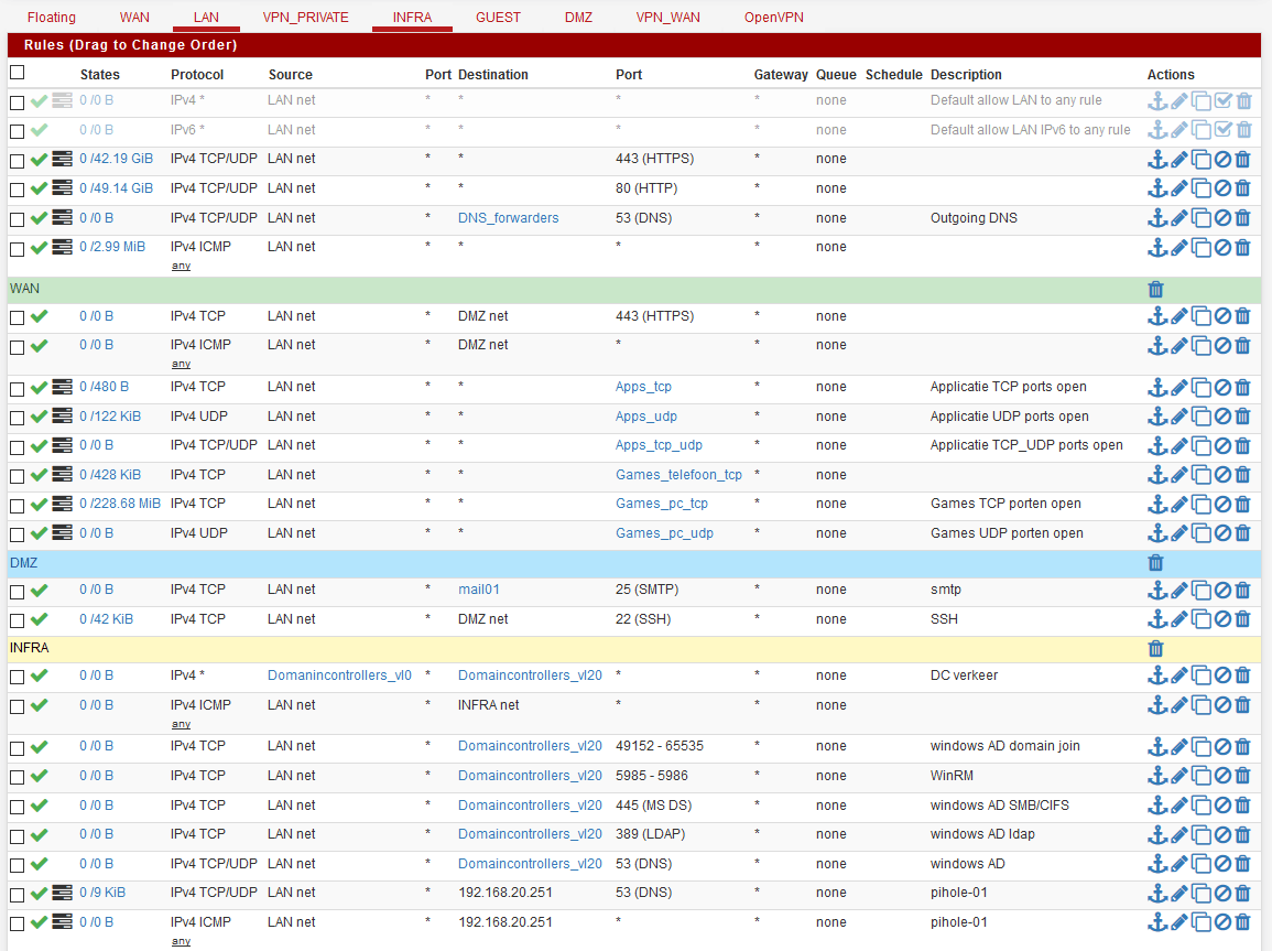 Bij mij thuis heb ik een virtuele Pfsense router draaien en heb ik verschillende vlannen (LAN, INFRA, DMZ enz).