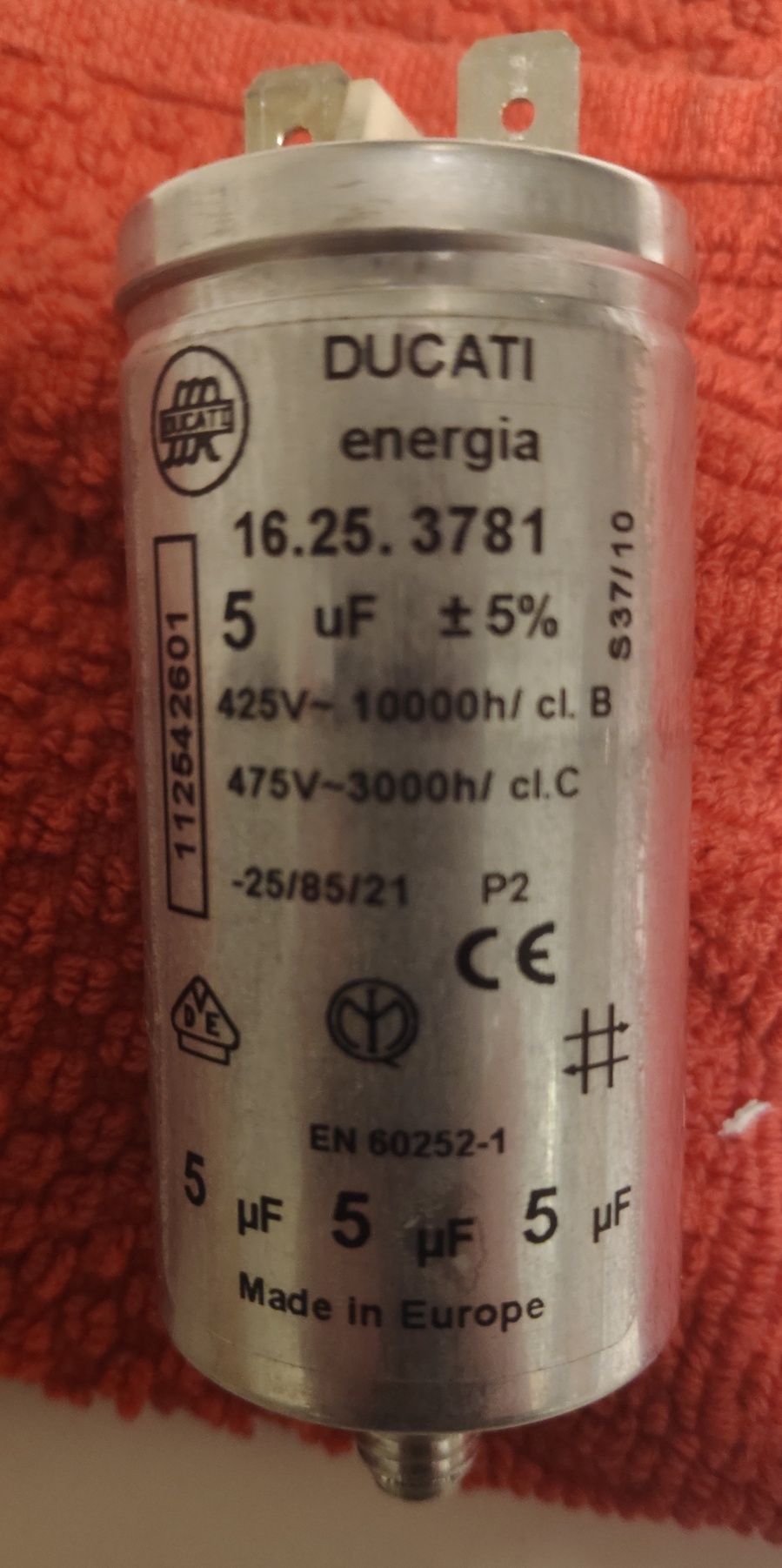 Mijn condensdroger (AEG Lavatherm T59850) droogt niet meer. De ventilator die de vochtige lucht de condensor in hoort te blazen draait niet meer. Als ik 'm echter een zetje geef start hij netjes op en blijft draaien. Niet gehinderd door enige kennis van elektronica ben ik op onderzoek gegaan en vermoed ik dat de startcondensator de boosdoener is.