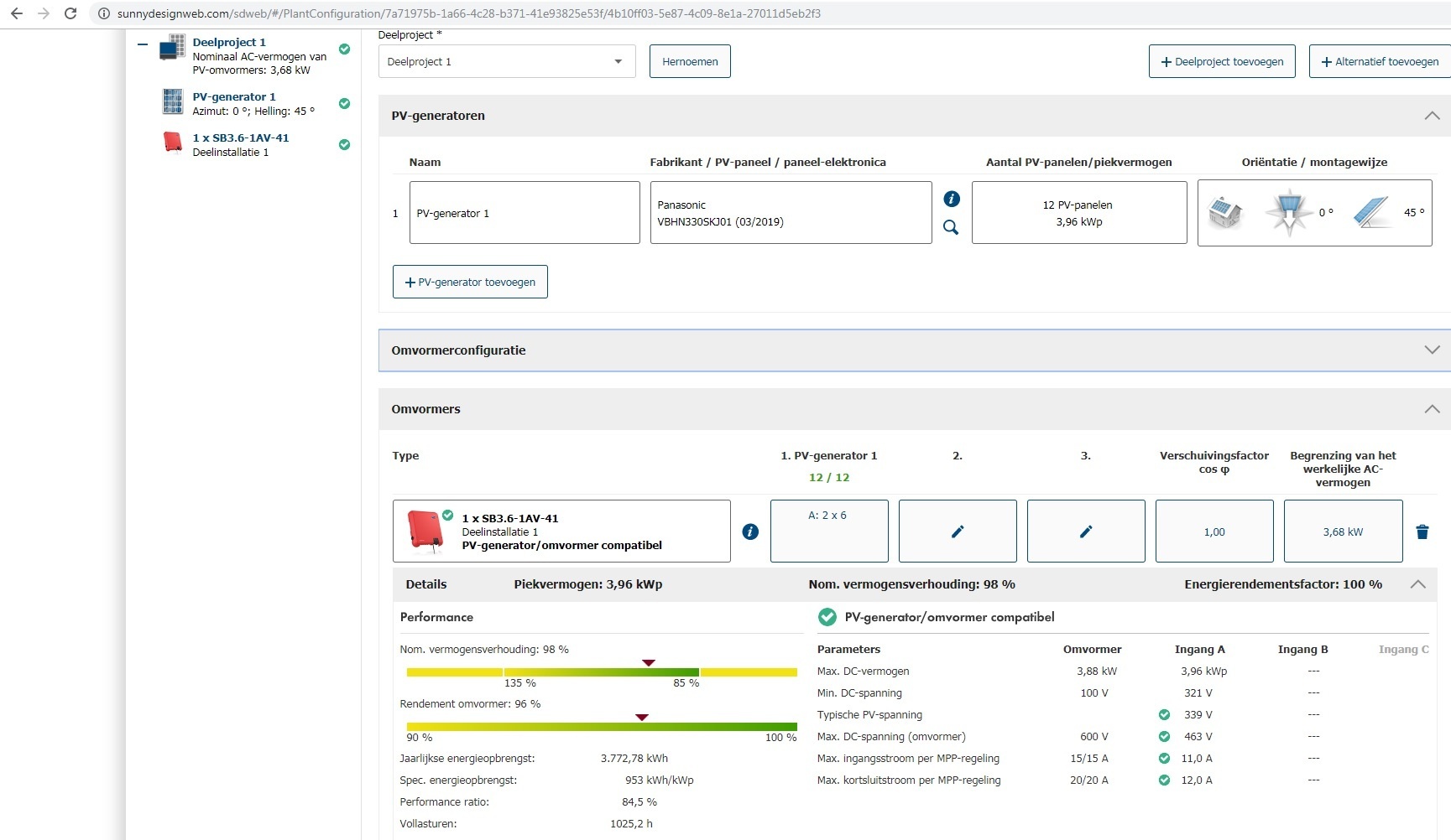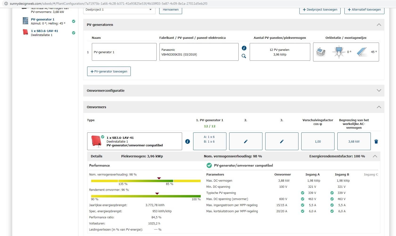 In 2 strings van 6 = 2x ~350 Vmpp, zie hieronder)