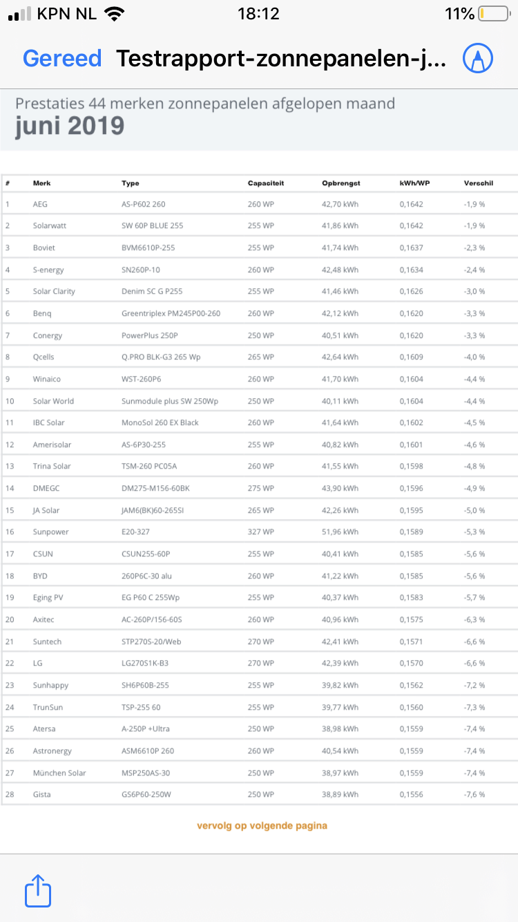 Ik hou daarom de testresultaten van zonnepanelen.net in de gaten, die hebben 45 verschillende zonnepanelen op 1 locatie staan, screenshot van hun testrapport van juni 2019: