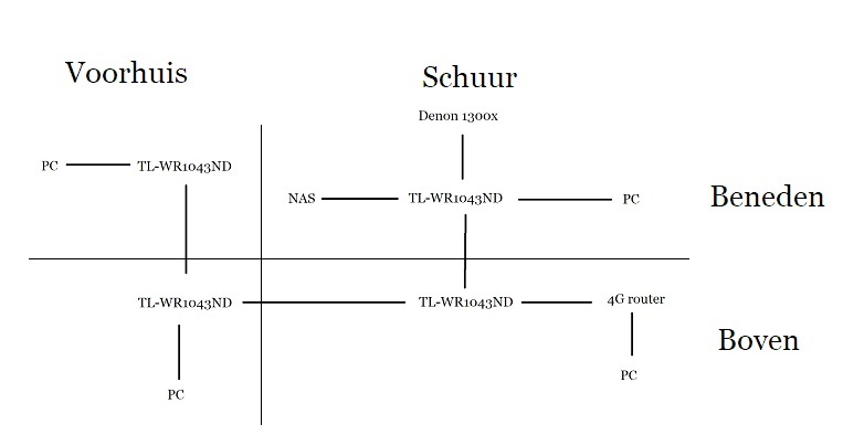 Ik ben bezig een netwerk aan te leggen in het ouderlijk huis. Dit huis is een redelijk grote boerderij met twee gedeeltes, voorhuis en schuur. De schuur wordt omgebouwd tot woonoppervlak en zodoende moet ook hier internet komen. Aangezien de boerderij in het buitengebied staat maken wij gebruik van 4G internet van KPN.