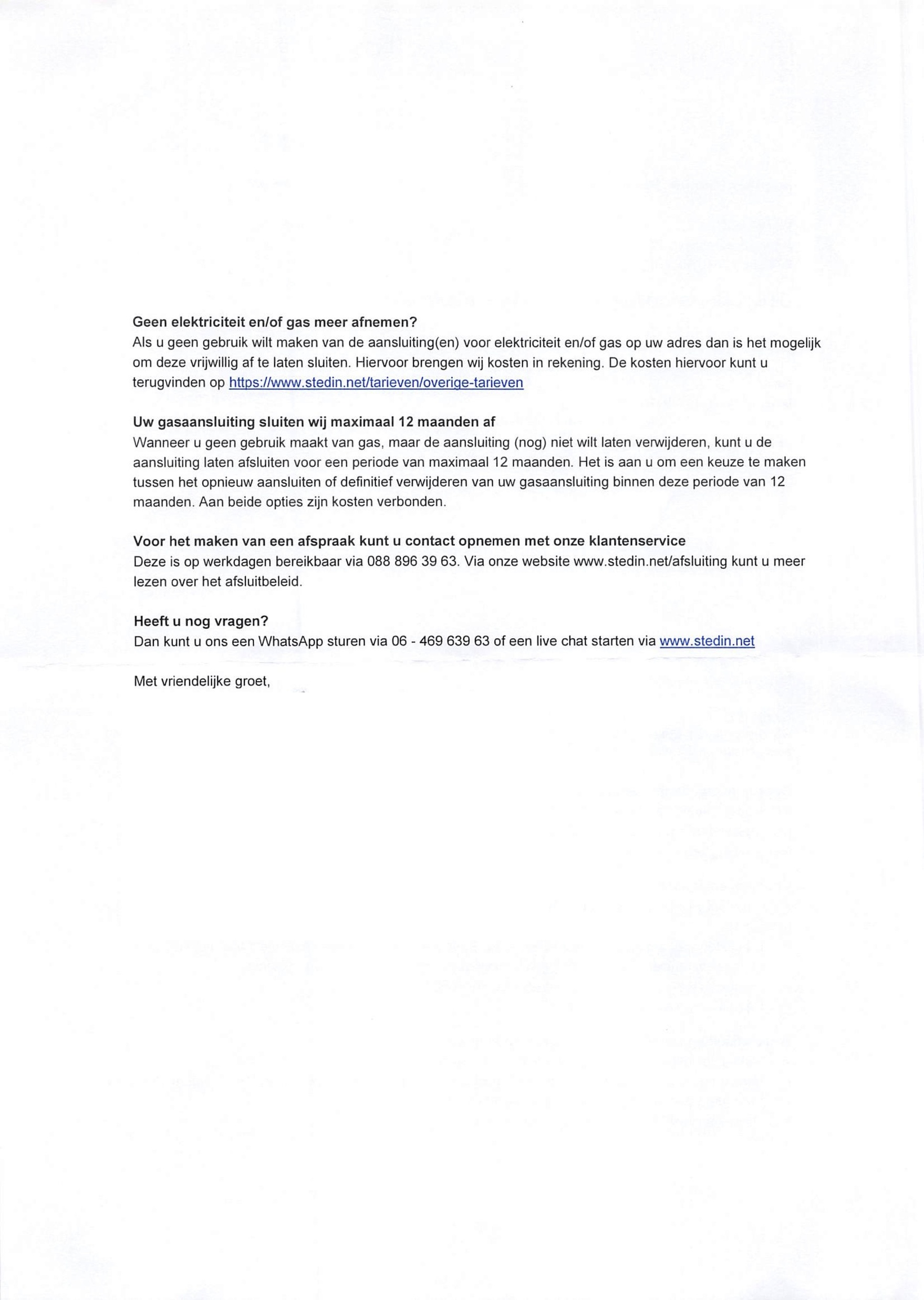 Ik bestrijd ook dat ik voor andere werkzaamheden die u noodzakelijk acht na beëindiging van de Aansluit- en Transportovereenkomst (ATO) kosten verschuldigd ben, indien ik daar geen opdracht toe geef. Daarvoor is geen grond te vinden in de Algemene Voorwaarden, en ook niet in de Tarievencode Gas.